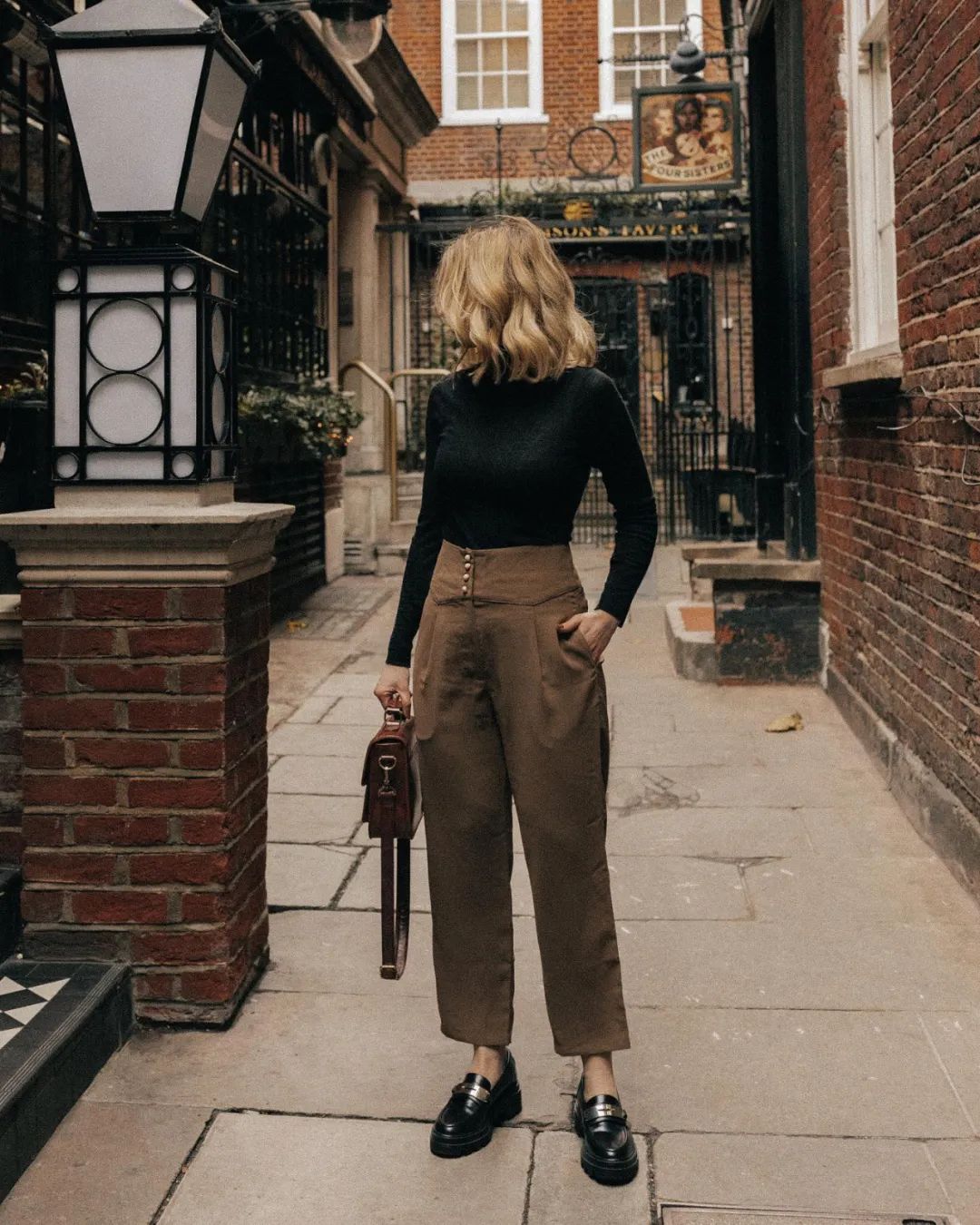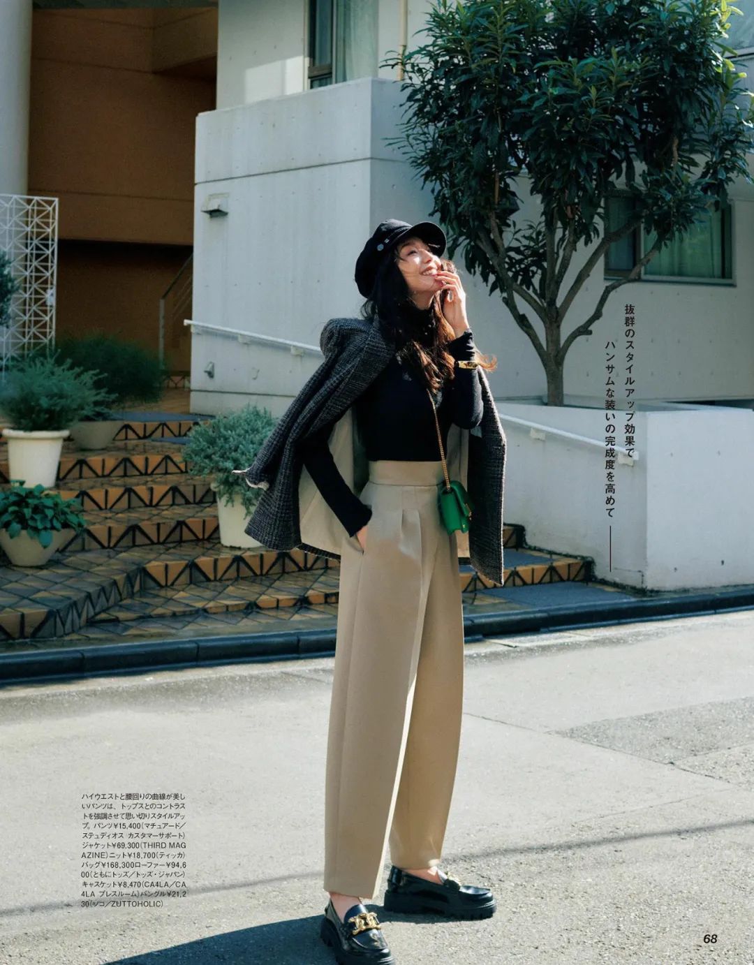 今年更流行搭配超长裤。乐福鞋跟阔腿裤、喇叭裤组cp,裤腿盖过脚面,有一种不羁的感觉。也挺显腿长的。▼