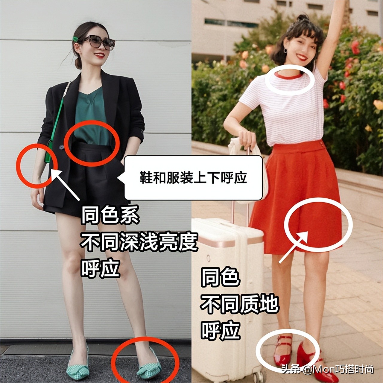 可以像左边那样,选择鞋子和服装局部为同色系,但色彩深浅亮度不同;也可以像右边那样,鞋子和相邻服装上下呼应,选择同色但不同质地增加变化。
