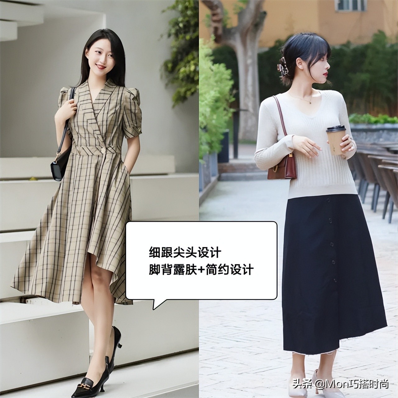 浅口高跟鞋优先选择细跟尖头的设计,对腿部的优化效果更好。想要更时髦一点,也可以选择瘦长鞋子配小平头的款式。