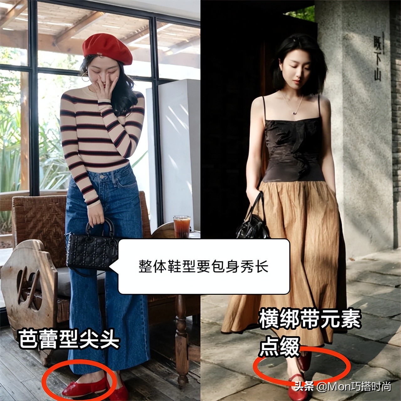 脚踝纤细和肩长脚型的姐妹可以选择带有横绑带元素的船型平底鞋,这样会让脚部看起来更加立体有层次感哦~