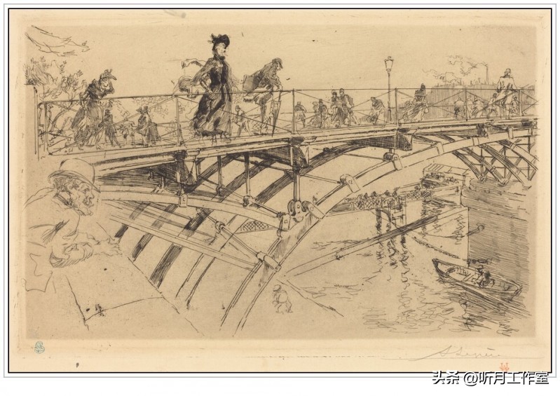 法国画家勒贝莱《艺术桥》1890年作。,以细腻笔触描摹河畔景致:石桥横跨碧波,行人驻足远眺,对岸建筑错落,光影中流淌着巴黎特有的艺术气息与静谧诗意。