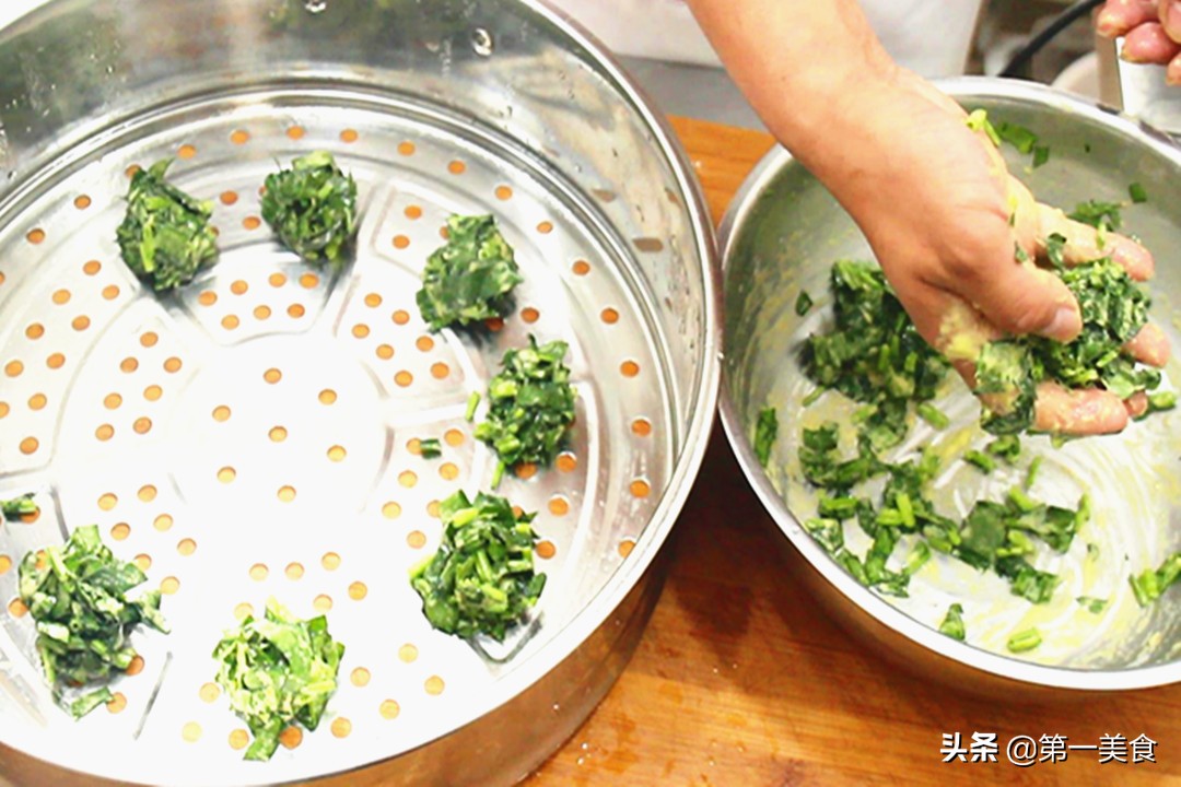 3.笼屉提前刷油省的粘连,把菜糊团成一个个的菜团子放进去,开水上锅,大火蒸8分钟就可以了。