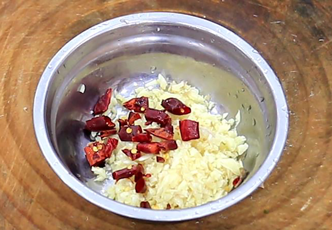 2.准备大蒜一小把,逐个拍散切成末放入盆中,再抓入几粒干辣椒备用。
