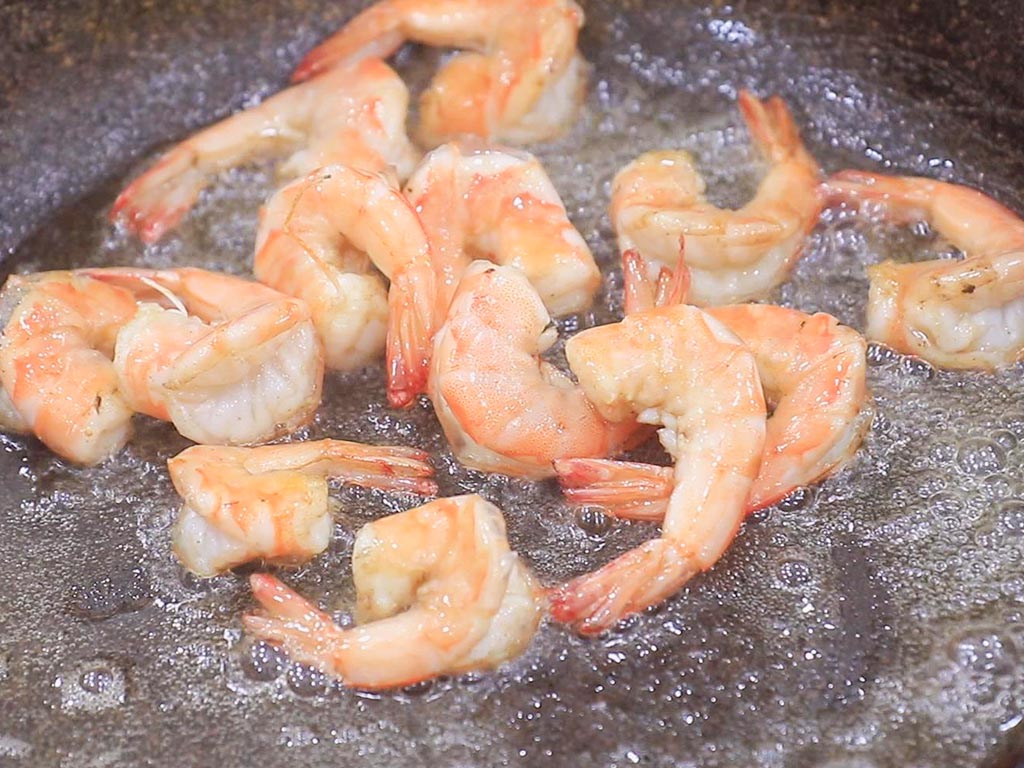 3.锅内烧油,油温五成热时倒入虾仁,开小火煸炒3分钟,经常用锅铲摁压虾头,挤出里面的虾油,虾头煸成金黄色时夹出来不要,然后虾仁下锅炒熟后夹出。