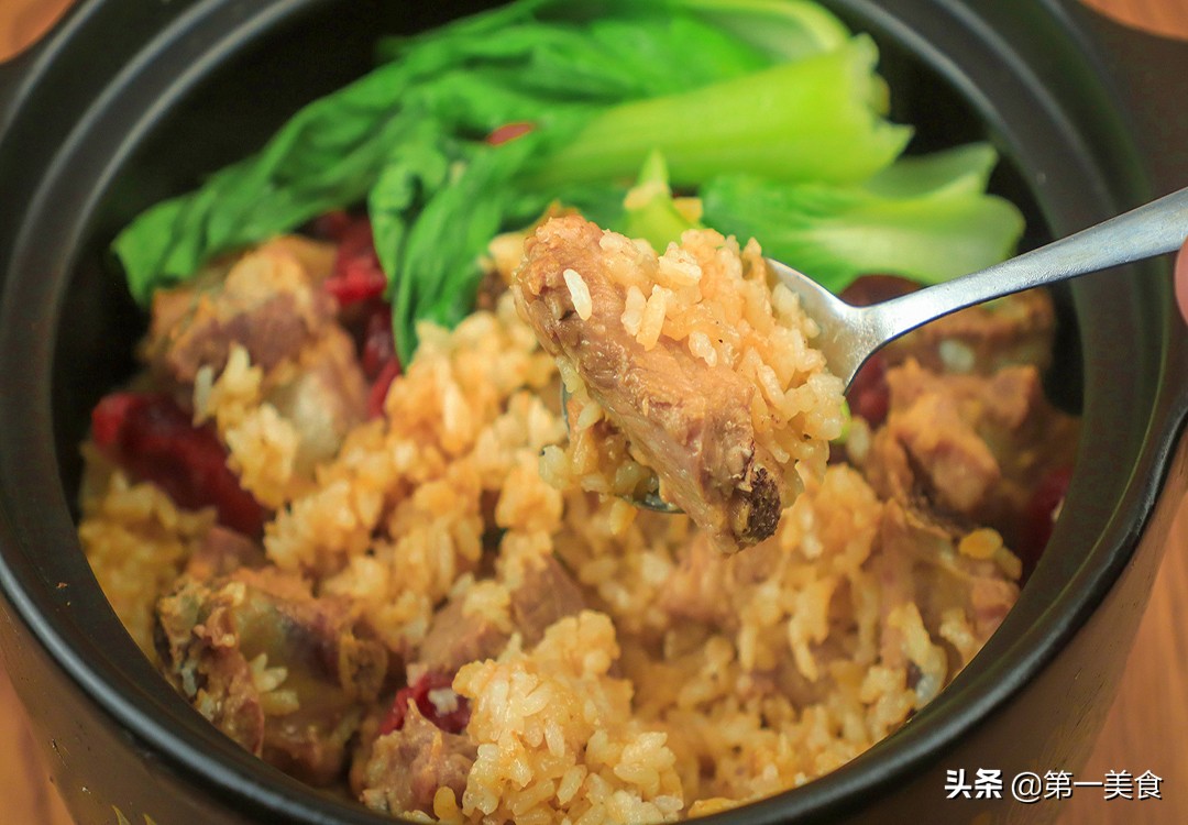 10分钟后砂锅中的水分已经基本收干,在上面扎一些小孔方便蒸汽流通,这样更容易把排骨和食材蒸熟,把排骨放在米饭上面,倒入切好的腊肠,盖上锅盖,沿着锅边淋入适量的米酒,米酒蒸发的过程会带走排骨的腥味,开小火煲20分钟,把排骨蒸熟、米饭蒸入味。