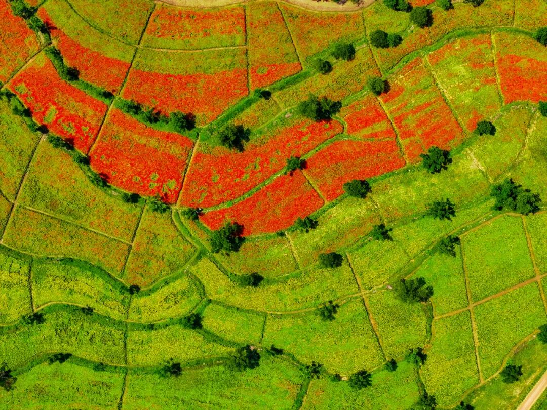 这片杜鹃沿着坡地肌理铺展,疏密间透着恰到好处的韵律:坡底的杜鹃开得更繁盛,挨挨挤挤连成一片红绸,仿佛要将大地裹进热烈里;往坡上走,花丛渐疏,却多了几分错落的美感,让整面坡地的红既有厚重的底色,又不失灵动的层次。花丛间偶见木质观景台的一角探出,似是特意为欣赏这份壮阔而设,站在其上,既能将漫坡嫣红尽收眼底,还能望见远处红叶景区水岸的粼粼波光。