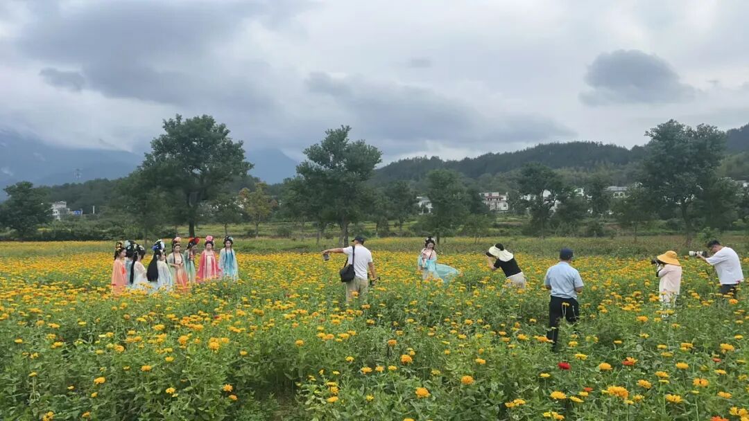 花海与水岸无缝衔接,花影直直地倒映在水里,与水面的蓝天、白云叠合,让水波也染上了斑斓的色彩——低头是岸边热烈的花,抬头是水中灵动的影,分不清哪里是花的尽头,哪里是水的开端。花田间的木质栈道沿着水岸延伸,踩上去会发出“咯吱咯吱”的轻响,与风吹花穗的“沙沙”声、水流的“潺潺”声交织,宛如自然奏响的乐曲。偶有蜂蝶掠过花间,翅尖沾着的花粉落在栈道上,留下细碎的黄与粉;偶尔有种子从花穗上脱落,顺着风滚向水边,又被轻轻的水波带向远方,像是在为来年的花海埋下希望的伏笔。