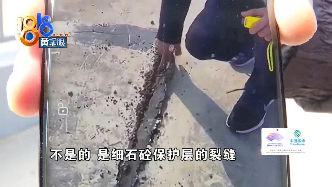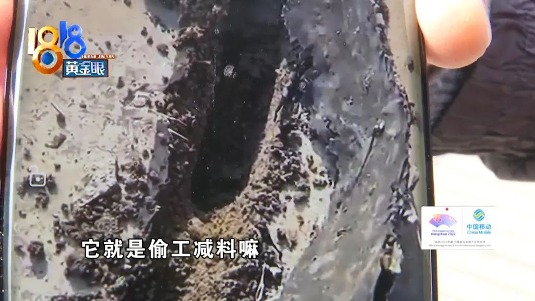 业主:“这个是伸缩缝,按照正规的操作流程,都是用沥青或者防水材料填缝,它就是偷工减料嘛,把楼体上的垃圾跟废料、沙土填进去。”