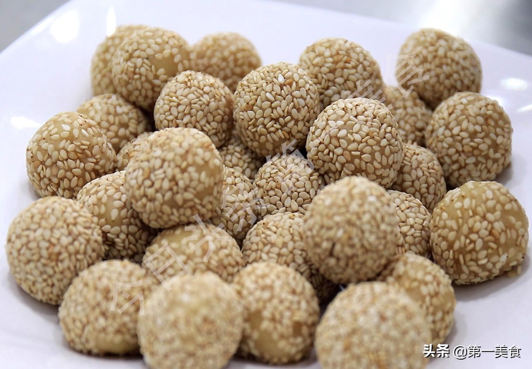 2.开始制作丸子坯:面团和光滑以后不需要醒发,直接用手把面团搓揉成一个一个的小圆球,放在白芝麻滚一下再用手团一团,团一团芝麻会裹得更结实,在油炸的过程中不容易掉落,把小丸子全部搓揉完。
