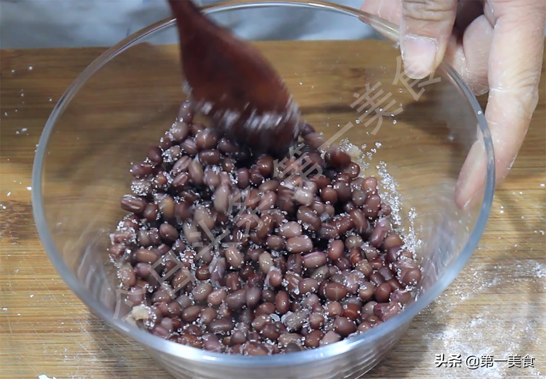 2.把红豆蒸一下:准备提前泡软的红豆,把它倒在蒸笼里面,上汽以后开始计时蒸15分钟就可以了,红豆蒸熟以后取出来,倒入盆中晾凉,晾凉以后放入一勺白糖拌匀备用。