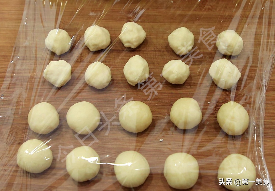 把油酥掰成20克左右的剂子,油酥和油皮的数量一样多,把油酥放在手心里团成团,也用保鲜膜盖住松驰10分钟。