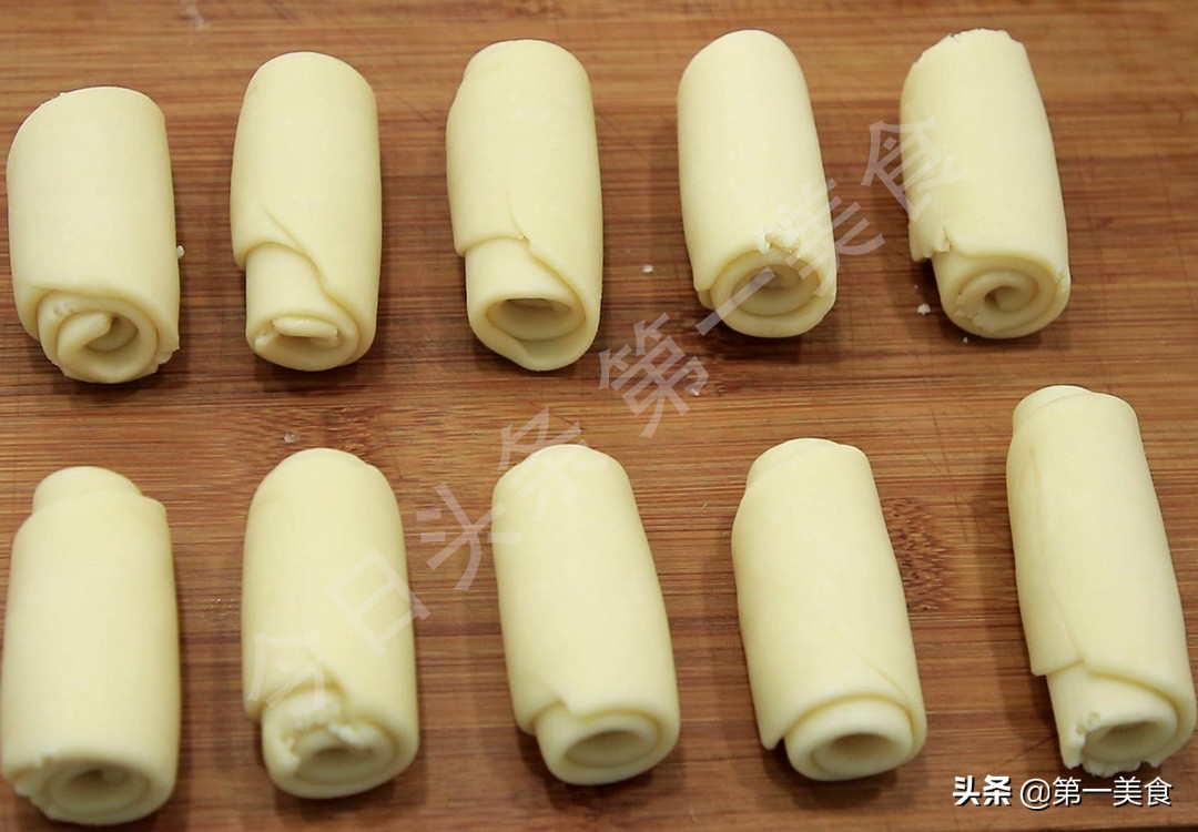 用手把油酥卷按成一个圆,再用擀面杖擀成一个小圆饼,用刀在四周切上几刀,两个手指捏起来,捏出一朵梅花的形状,用这个方法全部切好捏出花来,用筷子把每个梅花上面点个花,滴上一滴鸡蛋黄。