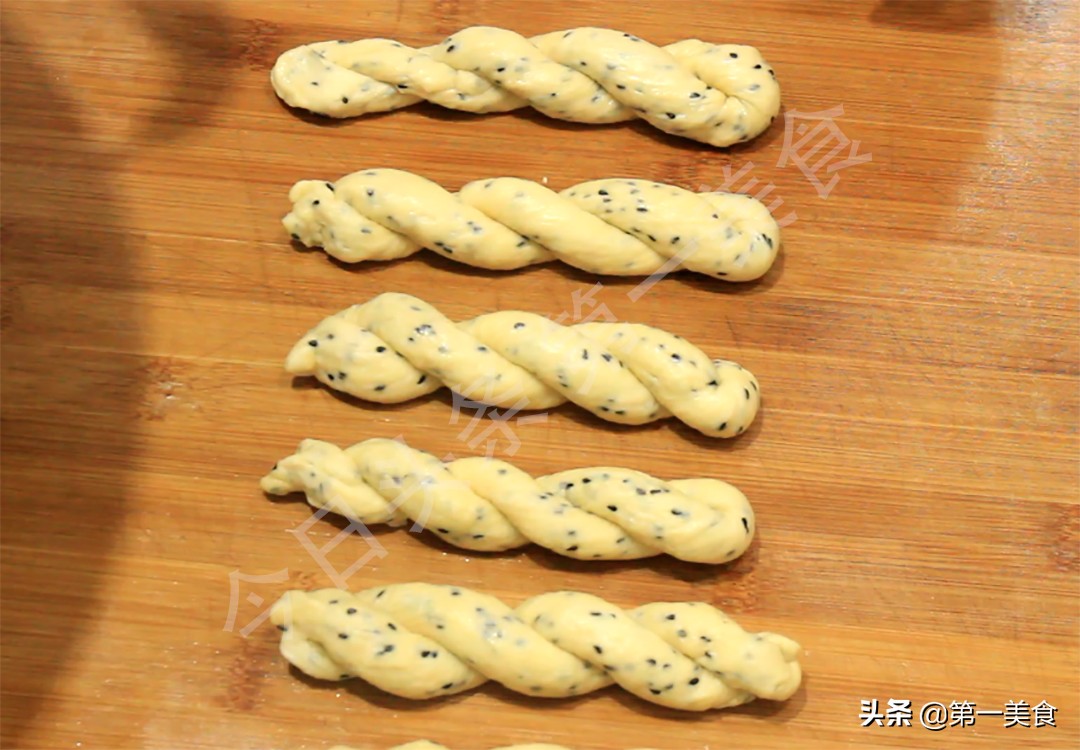 捏着其中一头,把另一头朝一个方向搓至上劲,对折起来,面条会自动地卷成麻花的形状,放在案板上再滚上一圈,花纹会更加地紧实好看,再把接口处捏在一起,麻花的生坯就做好了,做好的生坯静置饧上10分钟,这样炸出来的麻花会更加的蓬松酥脆。
