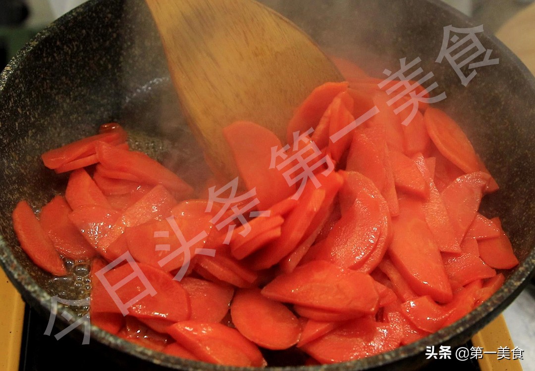 把锅烧热,倒入100克的白糖或者冰糖,再放入胡萝卜片用中火翻炒,不需要加水,炒的时候胡萝卜会慢慢析出汁水,目的就是把胡萝卜炒软、炒出里面的水分,保持中火,不停地用锅铲翻动让胡萝卜片均匀受热。