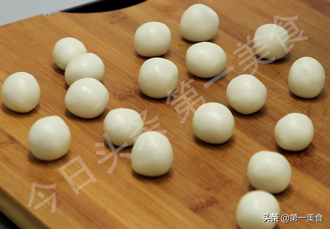 10分钟以后取出面团,用手搓成长条,切成比饺子稍大一点的剂子,搓成圆球。