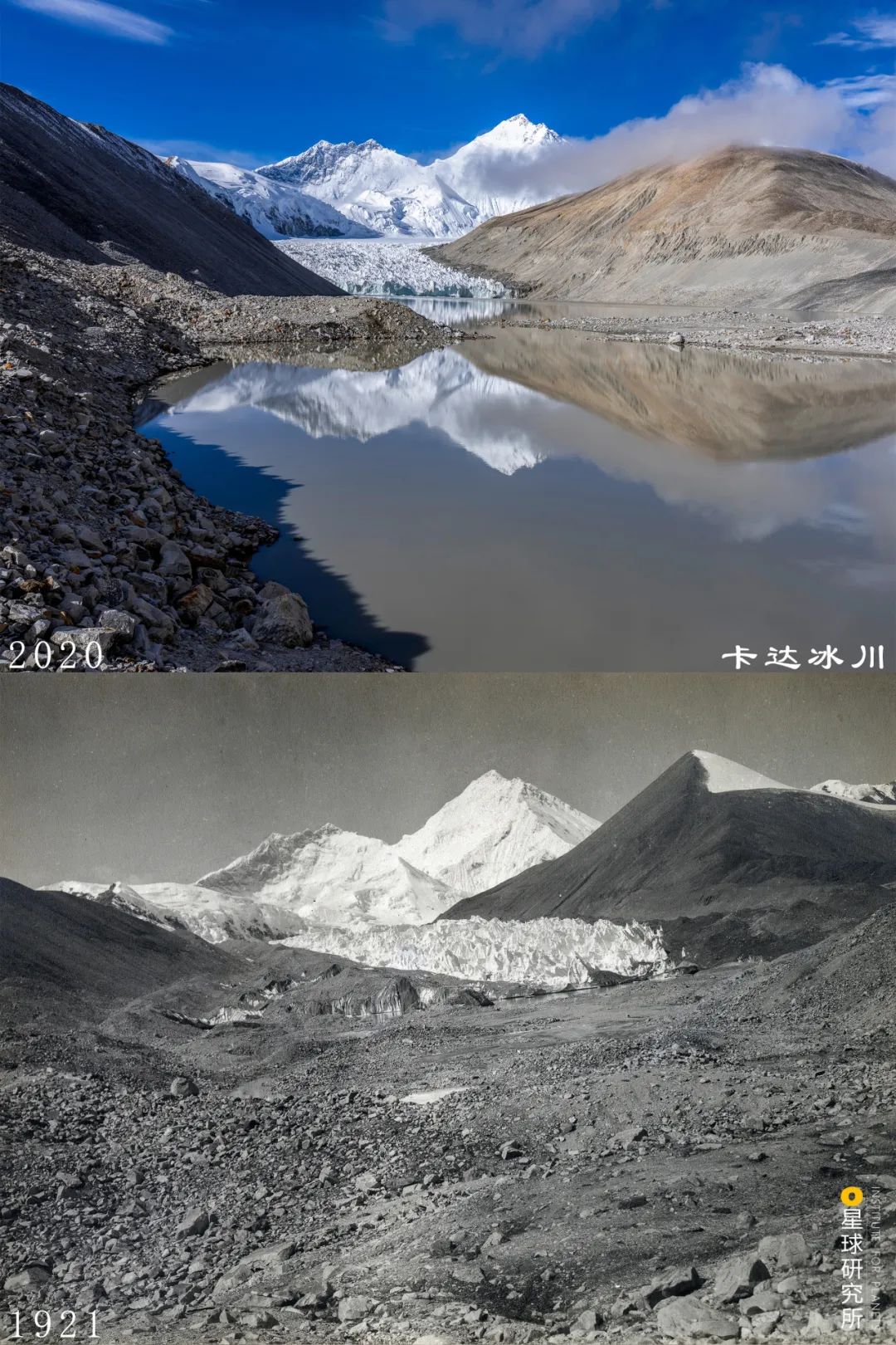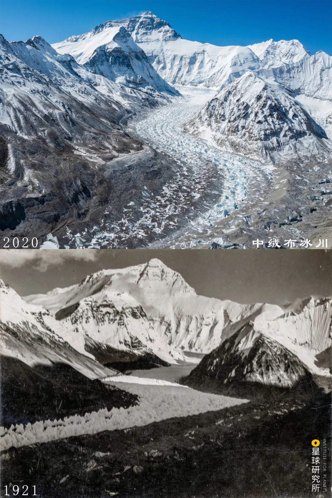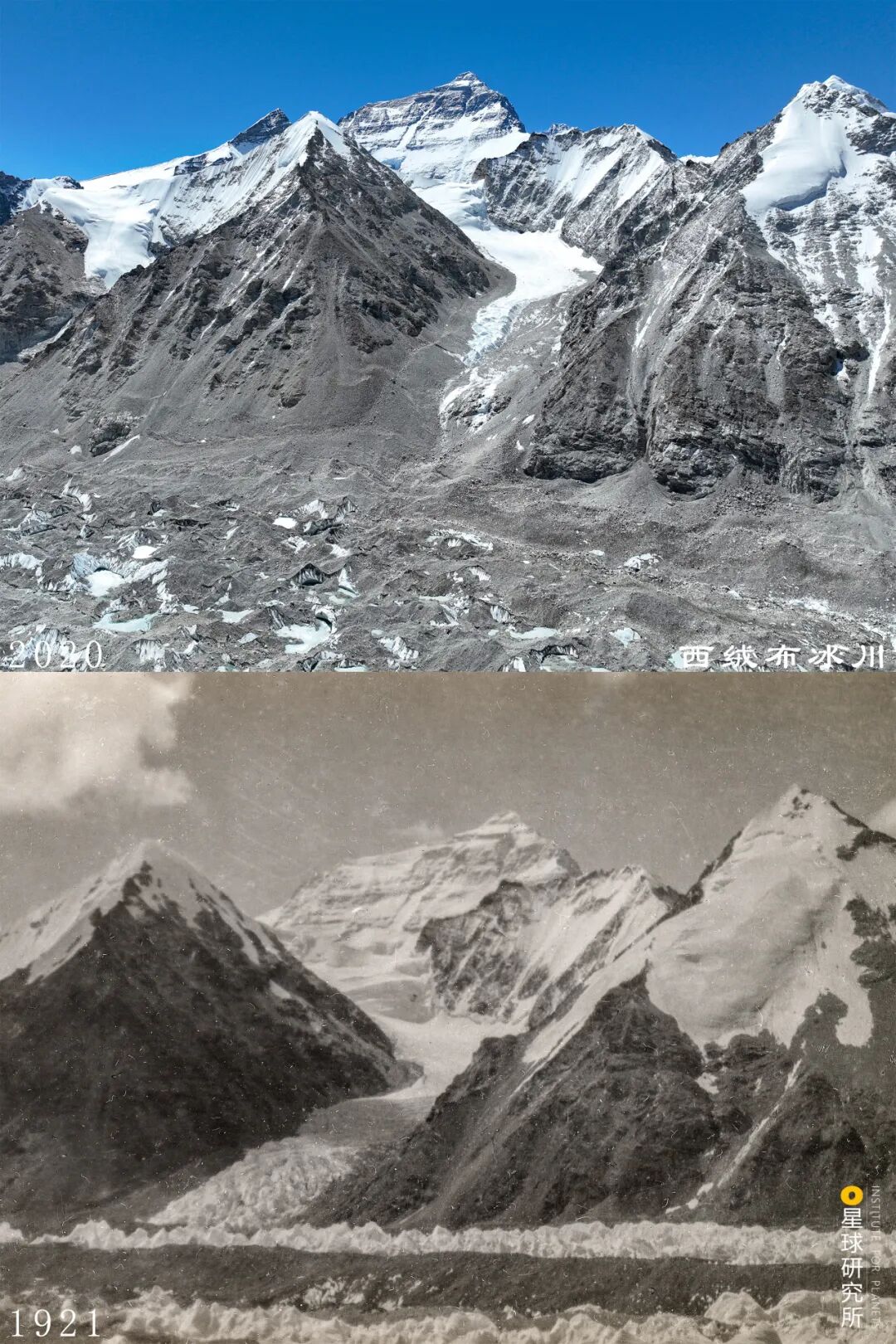 喜马拉雅山脉的冰川在1990-2015年的25年间就减少了约2553平方千米相当于400个西湖的面积(喜马拉雅山脉的多条冰川,在不同年份的对比图,图片来源@马春林&视觉中国)▼