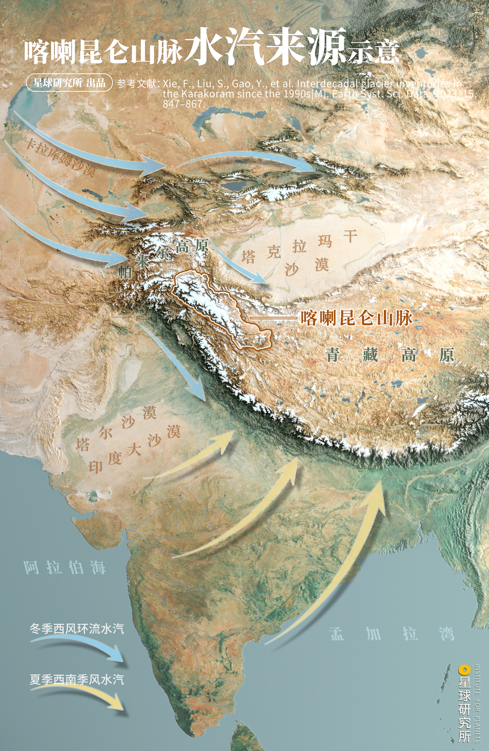 到了冬季西南季风退场更高纬度的西风环流南移登场将欧亚大陆西侧的大西洋、地中海等海洋水汽驱向青藏高原拂过喀喇昆仑如此便实现了一场“水汽大接力”(喀喇昆仑山脉水汽来源示意,制图@高俪倩/星球研究所)▼