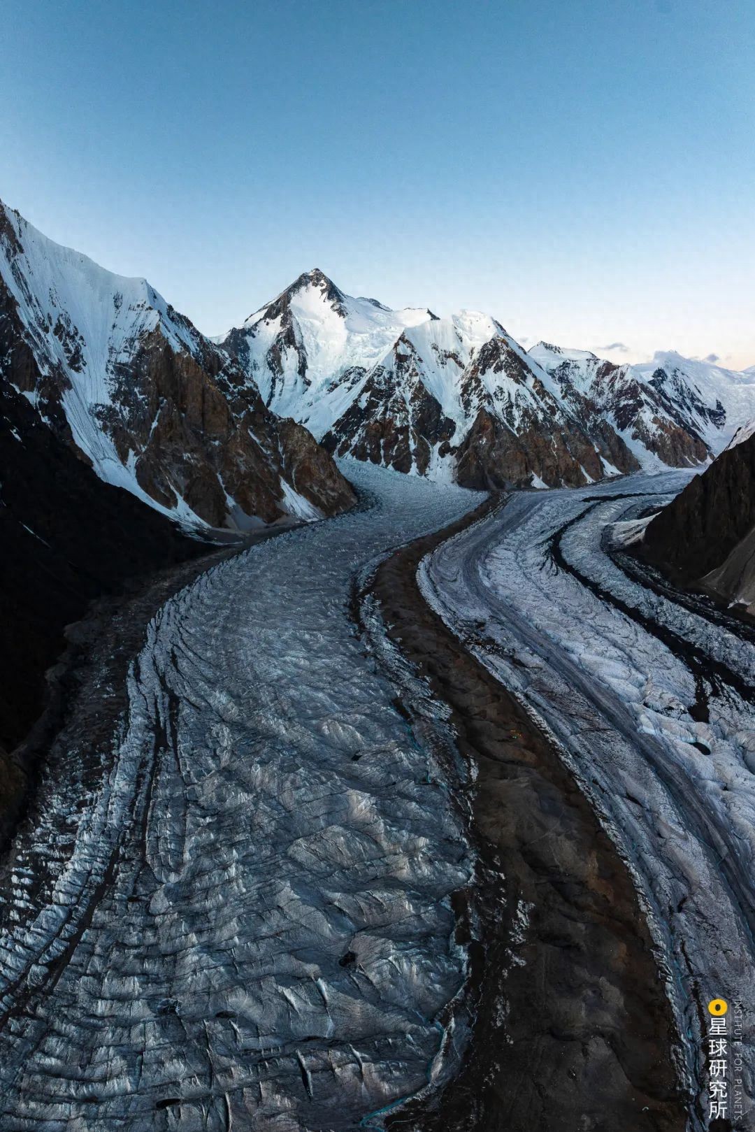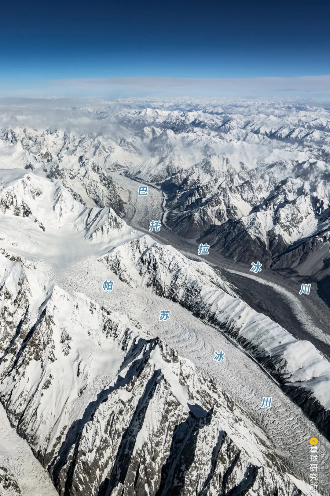 挖掘山谷打造一个独一无二的喀喇昆仑(飞机视角下,喀喇昆仑山脉的巴托拉冰川、帕苏冰川,摄影师@张凌霄;标注@冰蘑菇/星球研究所)▼