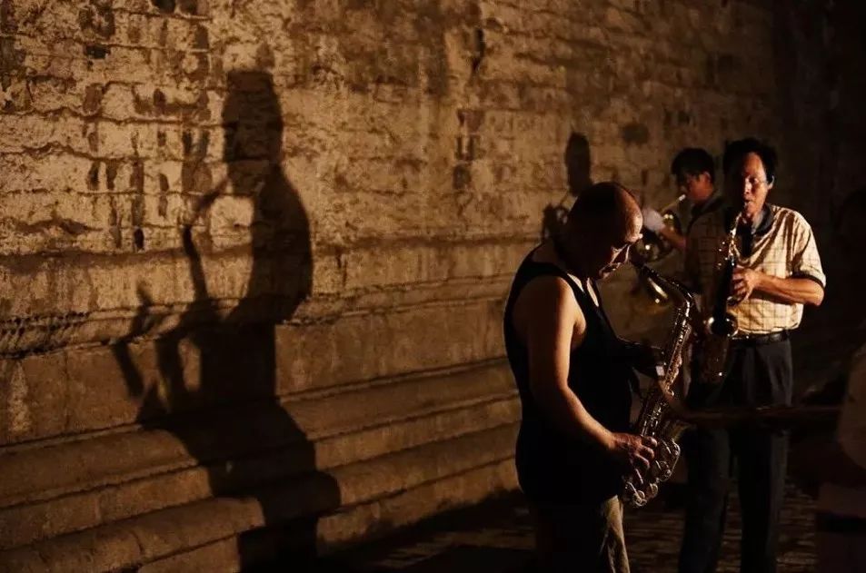 2013年7月8日,夜晚在城墙门洞里吹萨克斯。(西安门)