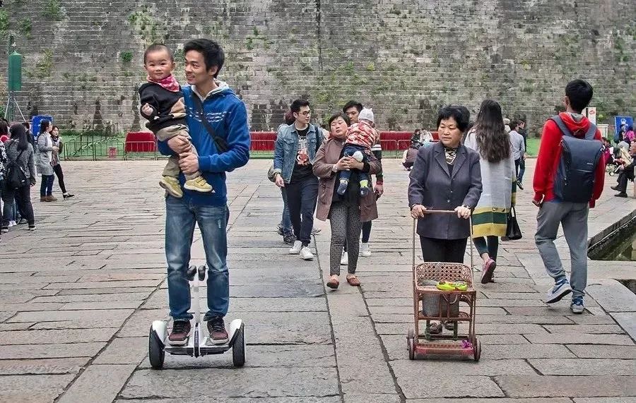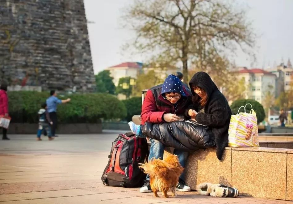 2015年10月9日,汉中门两条长凳上演着不同的故事。