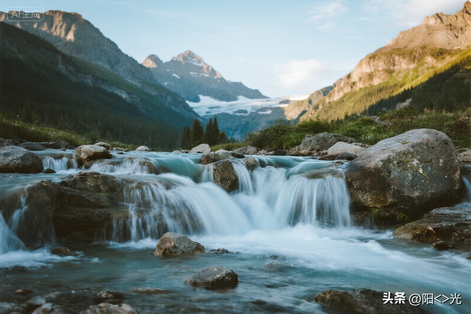山脚下,一条清澈的溪流潺潺流淌。溪水如灵动的音符,在光滑的石头间跳跃、欢唱。阳光洒下,水面波光粼粼,像是洒落了满河的碎金。溪边,五彩斑斓的野花星星点点地绽放,红的像火,粉的像霞,白的像雪,与水中的倒影相映成趣,构成了一幅绝美的水彩画。