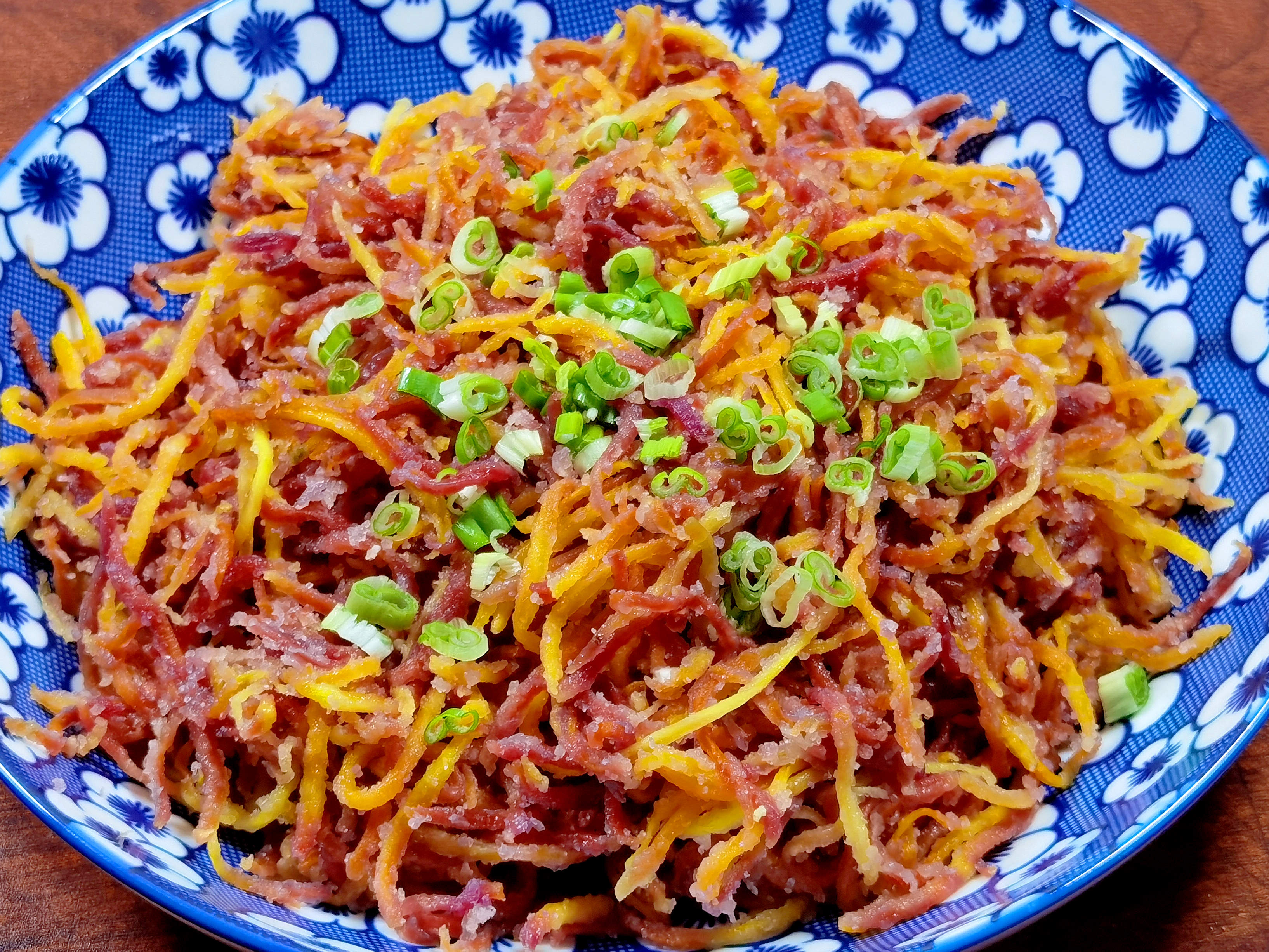 3. 蒸屉铺湿布,均匀铺上胡萝卜丝,水开后上锅蒸约5-7分钟,熟透后取出抖散。