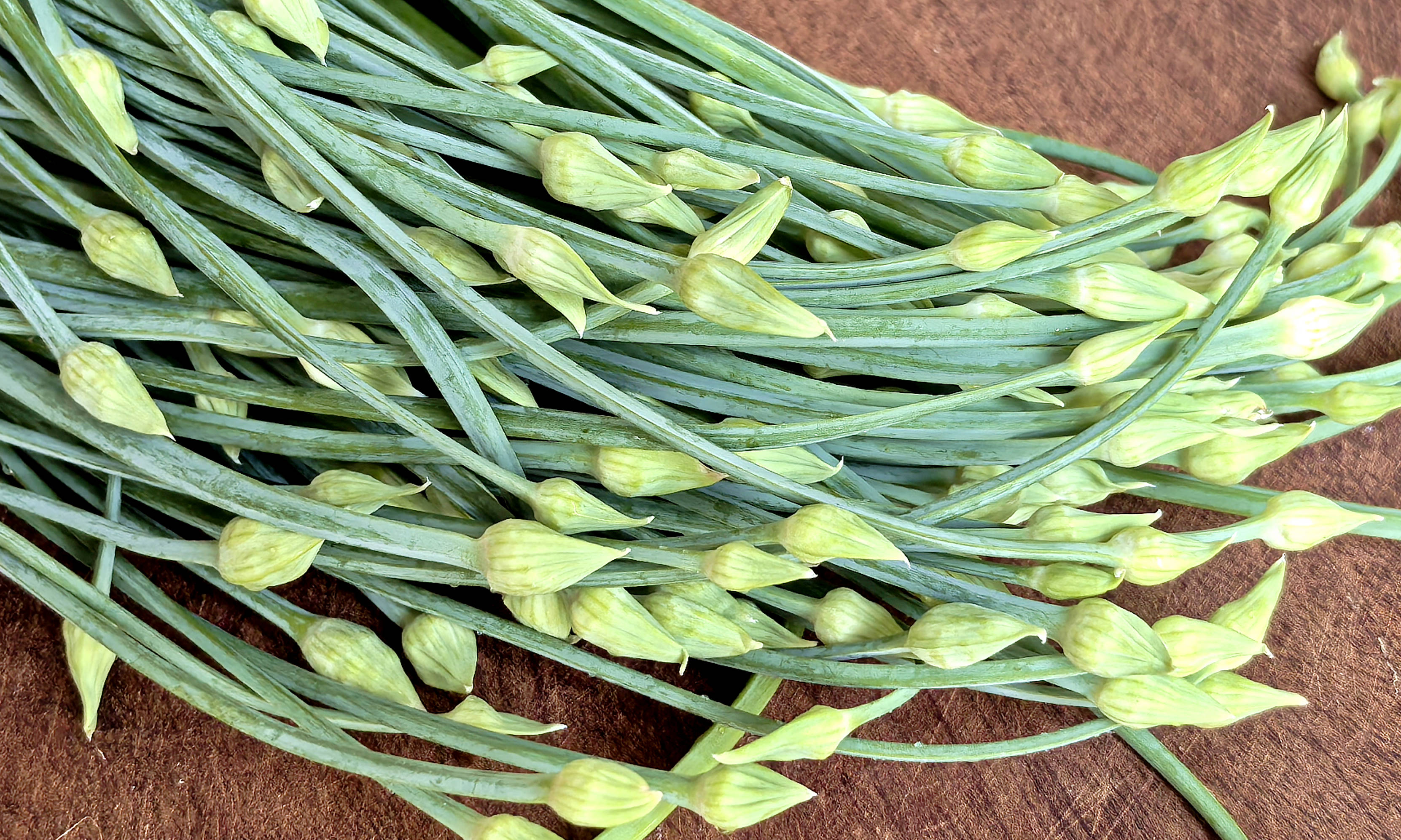 韭菜苔是韭菜精心养育的花茎,比普通韭菜更为鲜嫩脆爽,香气浓郁却不过分辛烈,带着秋日阳光的温煦气息。它富含膳食纤维,温中行气,正是初秋温润脾胃的佳品。