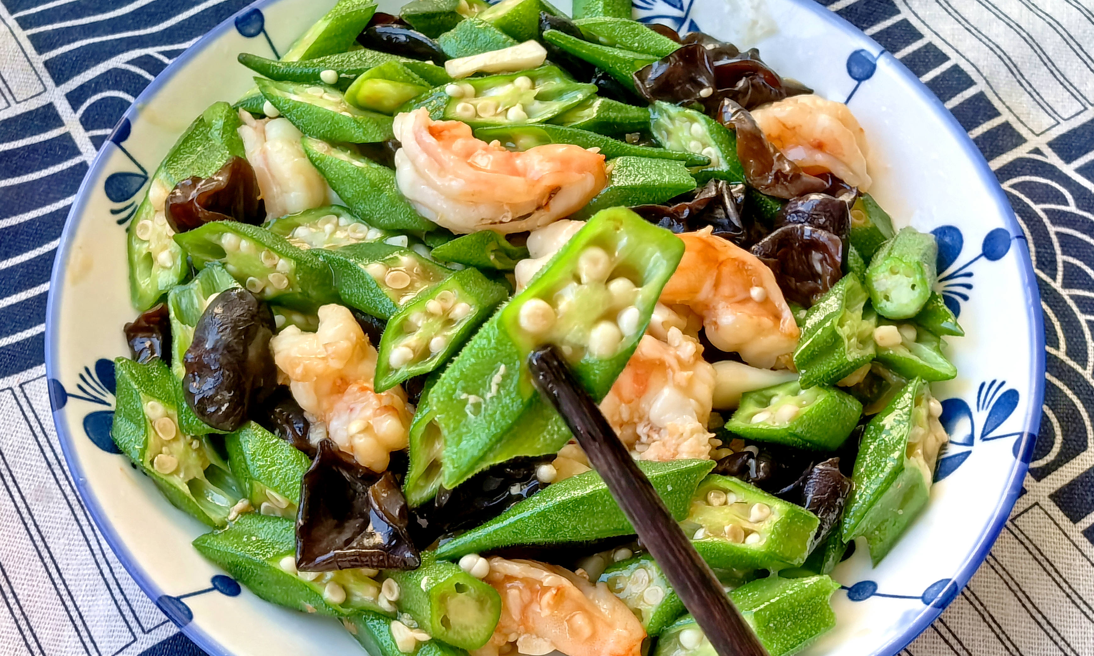 3. 余油下秋葵、木耳翻炒,加少许生抽、盐调味,最后加入虾仁翻炒均匀即可出锅。