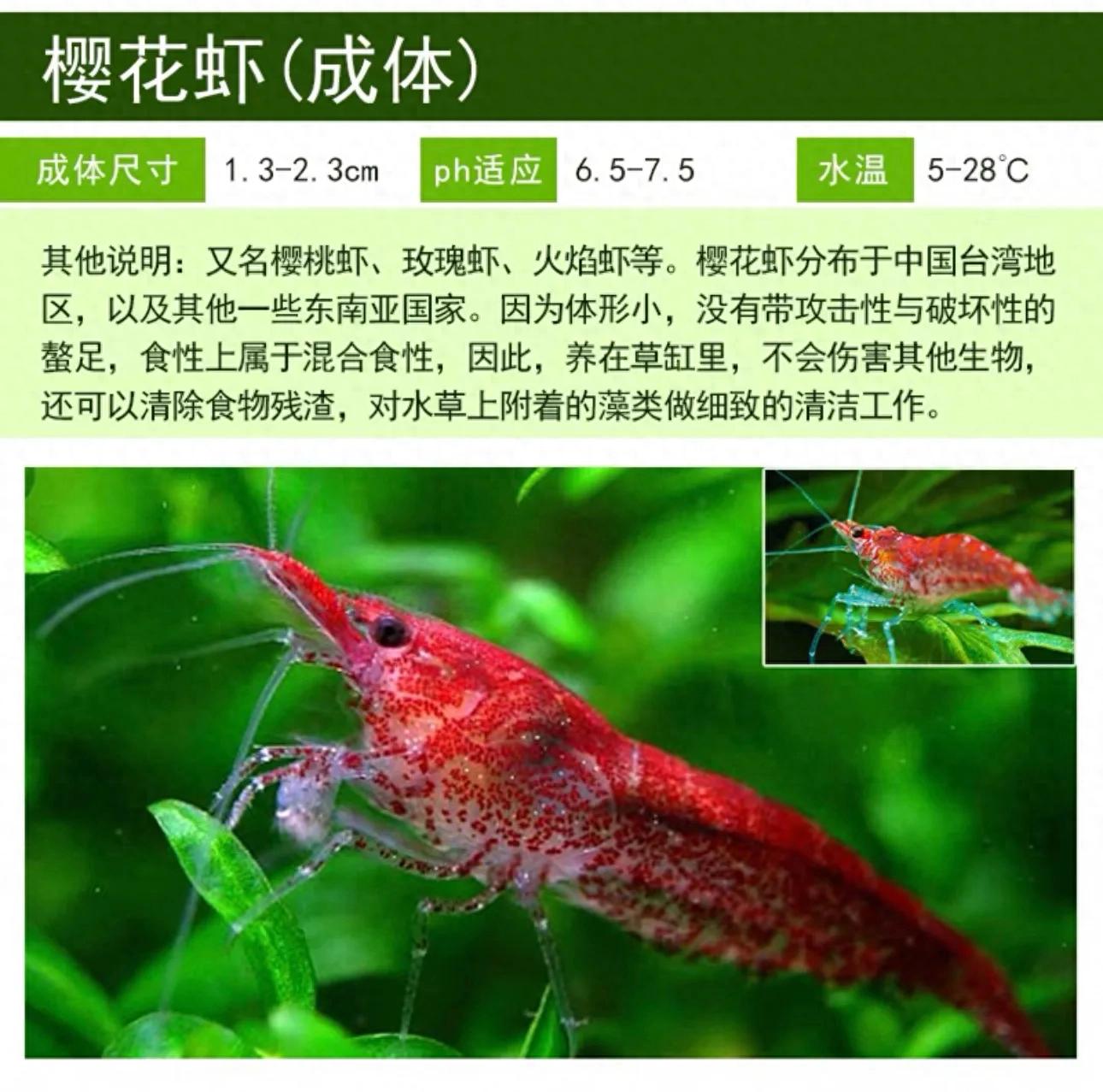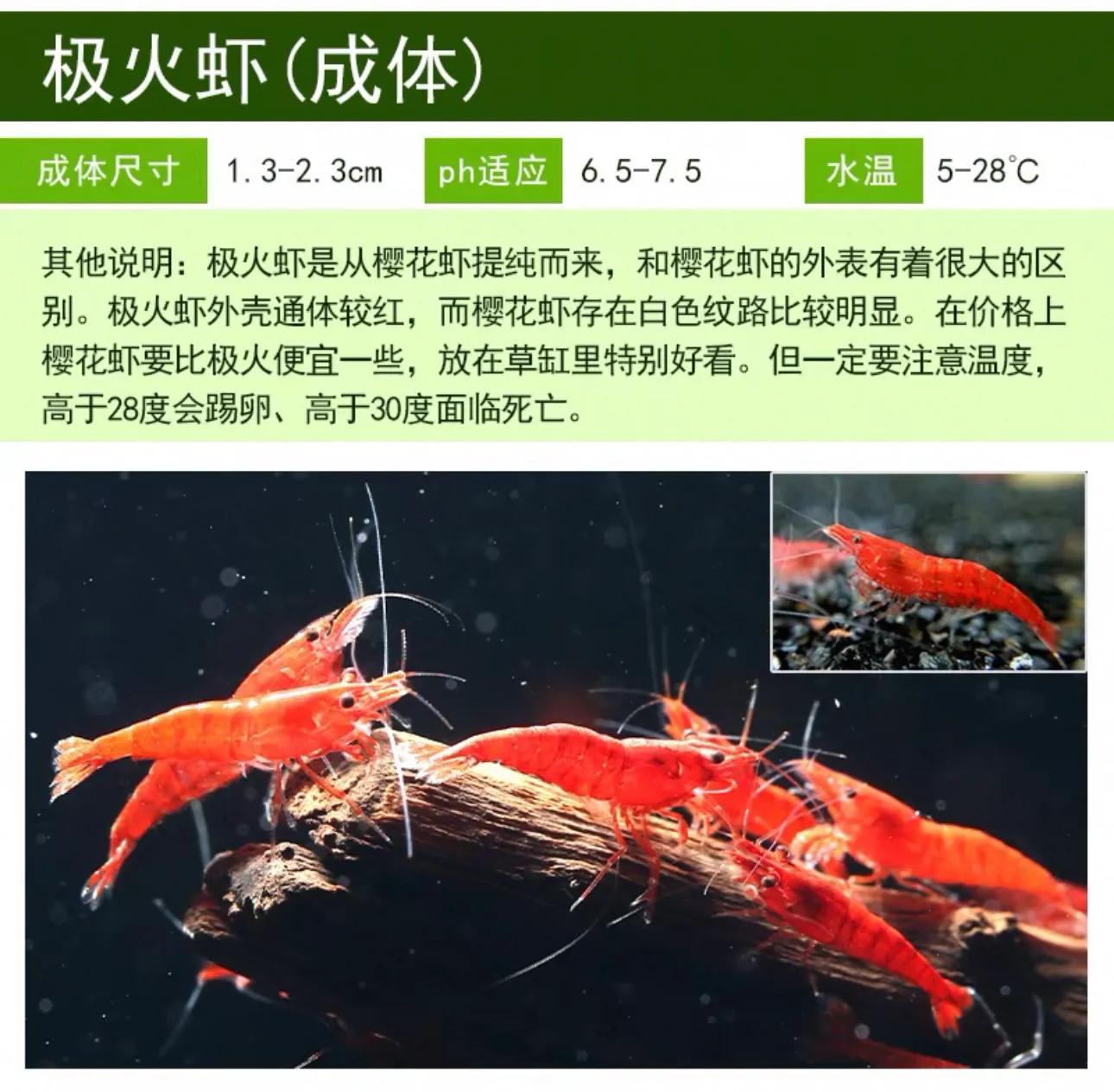 • 特点:樱花虾提纯品种,通体火红色,观赏性极佳,兼具清洁能力,适合草缸造景。