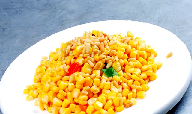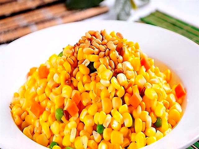把松仁先120℃烤箱烤6分钟,比直接下锅炒香三倍;玉米用冷冻甜粒,不解冻直接下锅,温差让颗粒更弹。