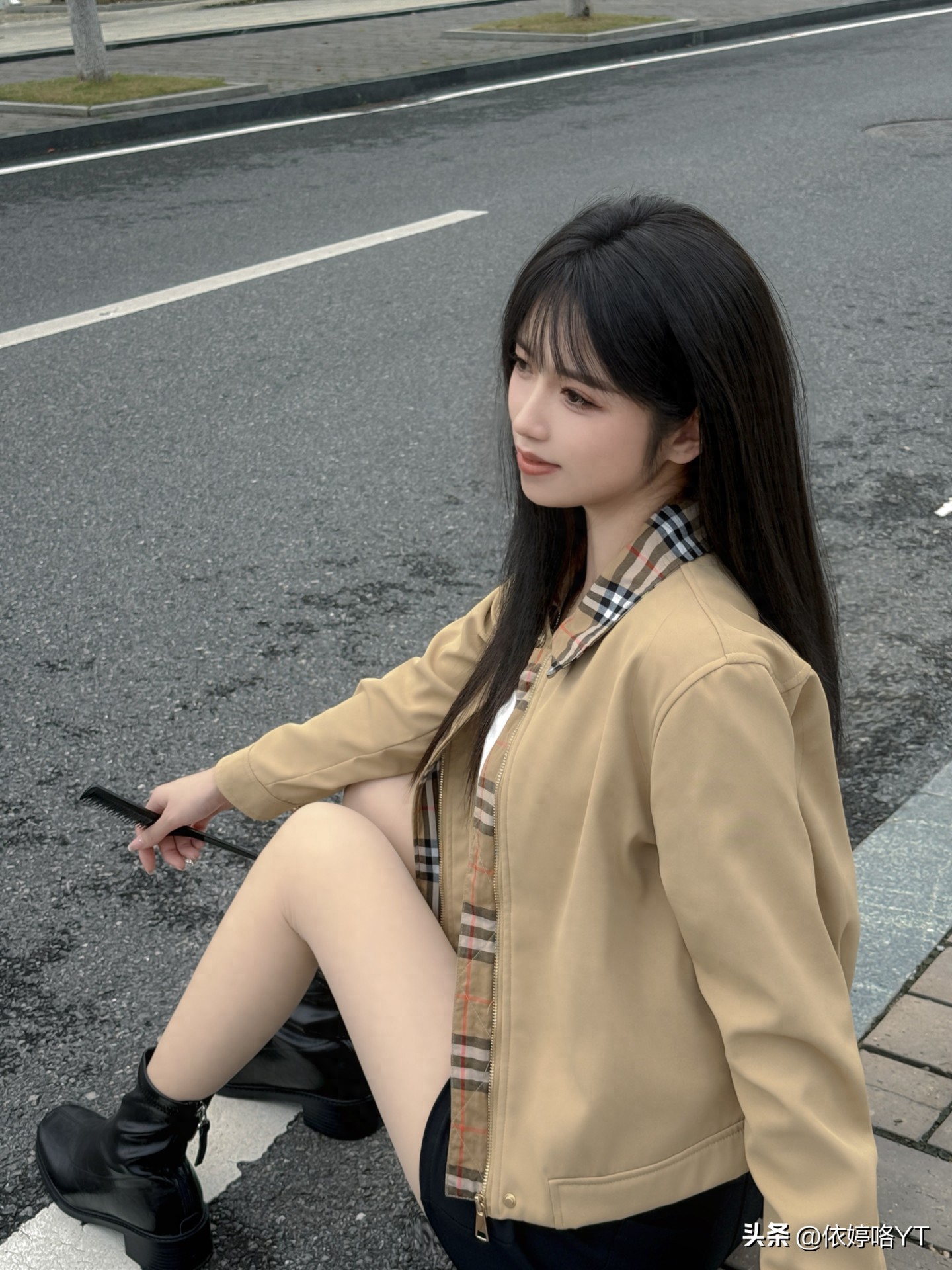 小金扣外套质感绝了,配灰短裙把比例拉得超棒,焦糖色短靴一穿,秋日氛围感瞬间到位