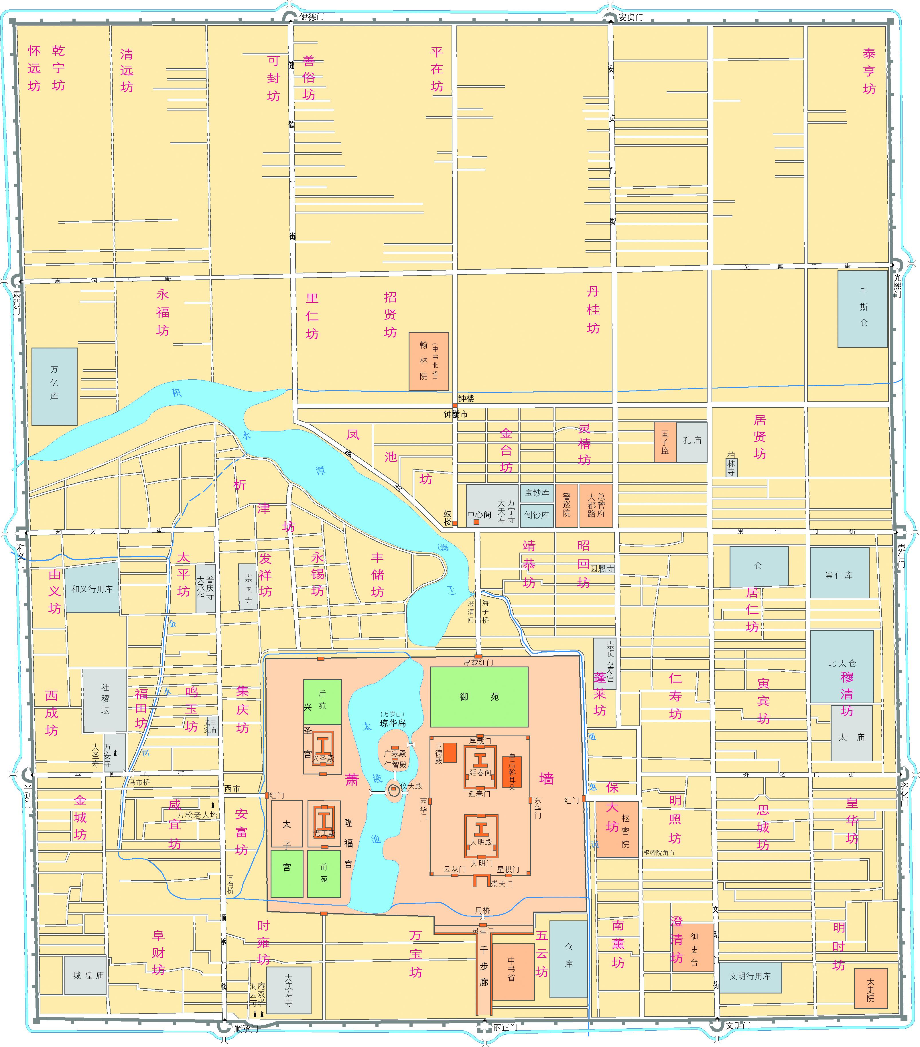 金朝时期,海陵王迁都并改其名为中都,仿照北宋汴京的规划和建筑式样,在辽南京城的基础上在东、西、南三个方向往外扩展,动用了120万人,历经两年建成。中都都的中心是皇城,东西窄,南北长,周围3里。皇城中有宫城,中心则是大安殿,为朝会庆典之所。玉华门外是皇家园林同乐园,有鱼藻池等名胜,鱼藻池即太液池。皇城外为都城,周围36里,共13个城门。