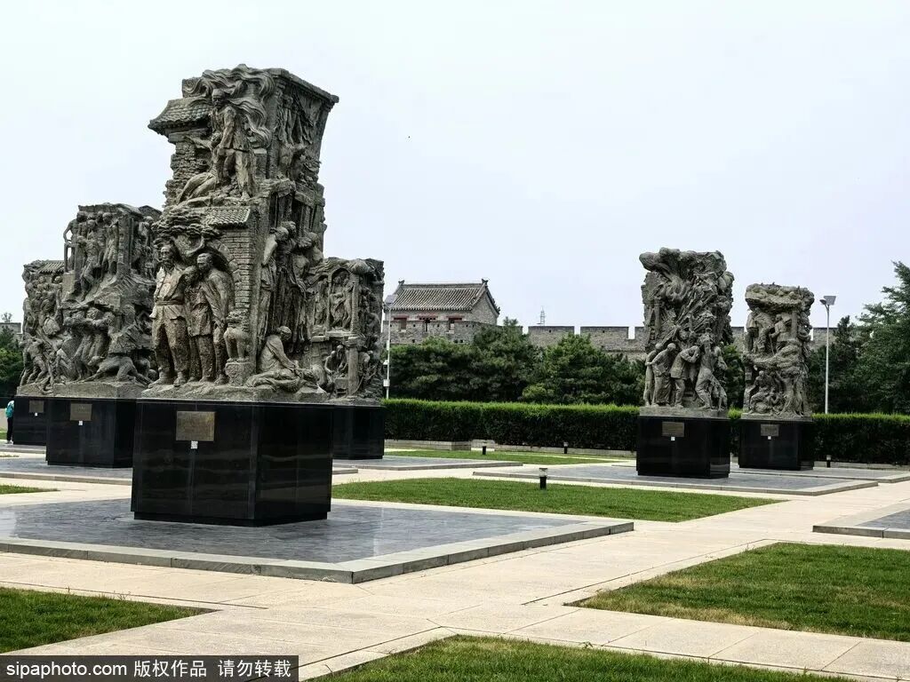 与宛平古城墙的弹痕、抗战雕塑园的群像