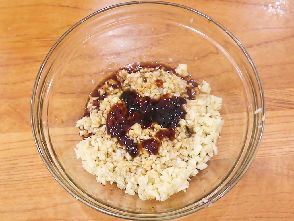 4.蒜的量可以多一些,全部切成碎末,然后加入生抽,蒸鱼豉油,蚝油,料酒,然后搅拌均匀就可以了。