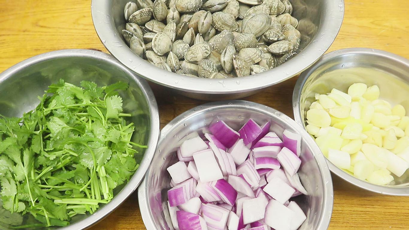2.锅热烧油,放入葱姜蒜、洋葱片爆香,然后把花甲倒进去直接生爆,翻匀以后加第二次洋葱,然后盖上锅盖焖煮至花甲全部开口,加入香菜、小葱段颠锅翻炒即可出锅。