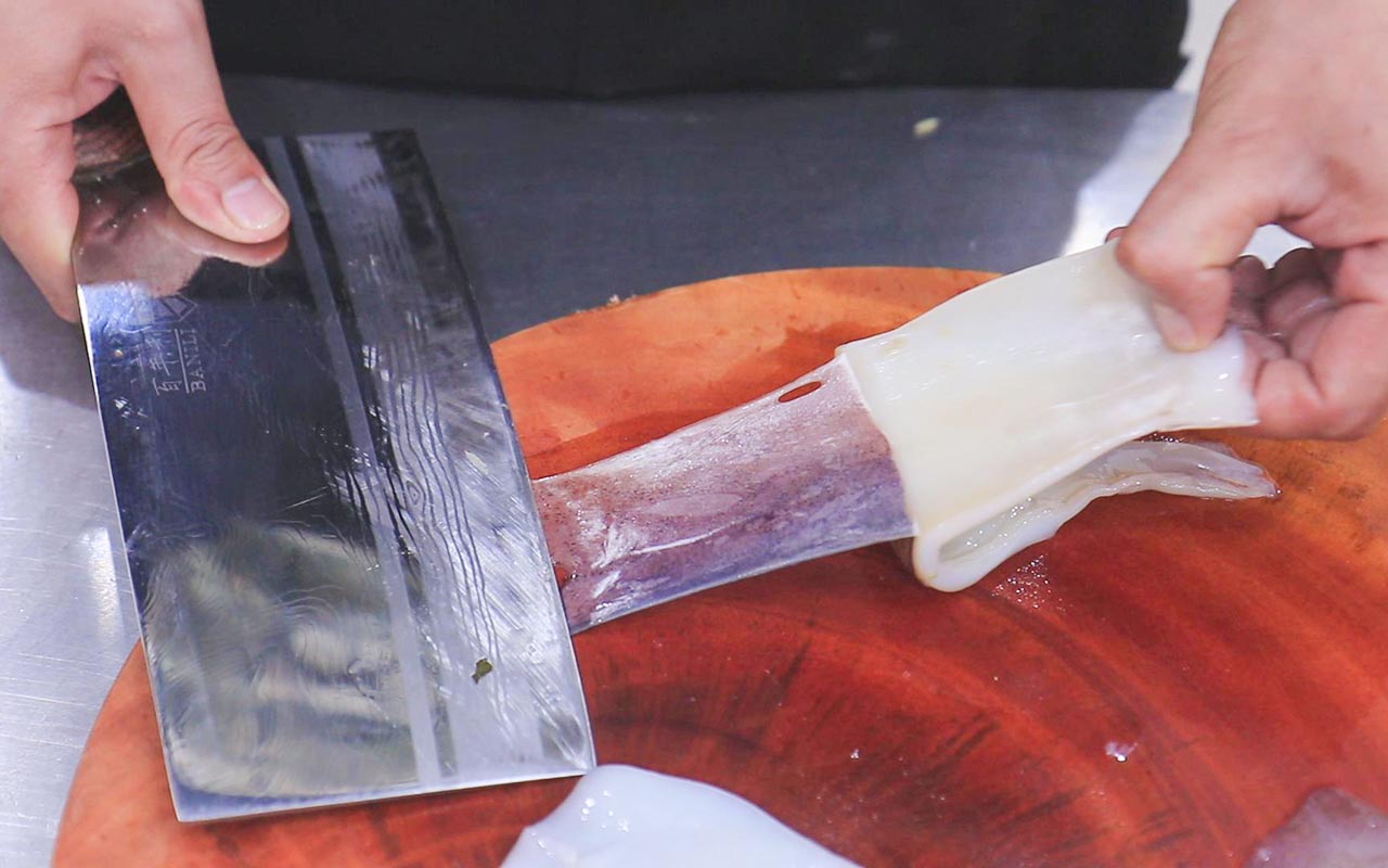 1.两条鲜鱿鱼,把鱿鱼的尾巴切下来,然后将身体对半切开,然后贴着鱿鱼的皮片开一条缝,用刀压着这条缝,很轻松就能把整张鱿鱼皮撕下来,再把鱿鱼尾巴上的黑膜用刀刮干净。