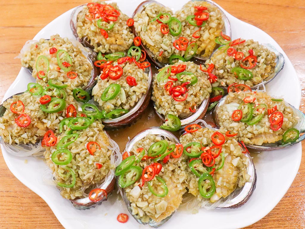 5.鲍鱼壳上稍微垫一点泡软的粉丝,粉丝吸收海鲜味儿会更好吃,然后把改好刀的鲍鱼放在粉丝上面,最后把调好的蒜蓉涂抹在鲍鱼上就能开始蒸制了。