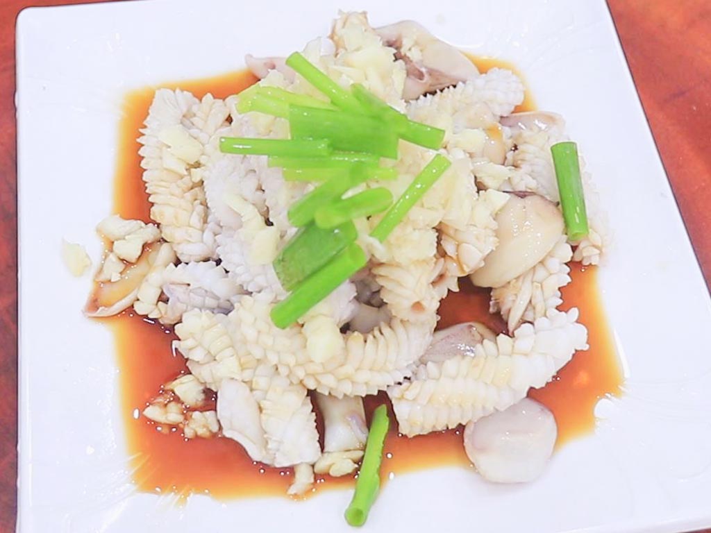 5.锅内烧油,油温七成热时起锅,把热油浇在蒜末上激出香味,鲜香可口的葱香鱿鱼卷就做好了。