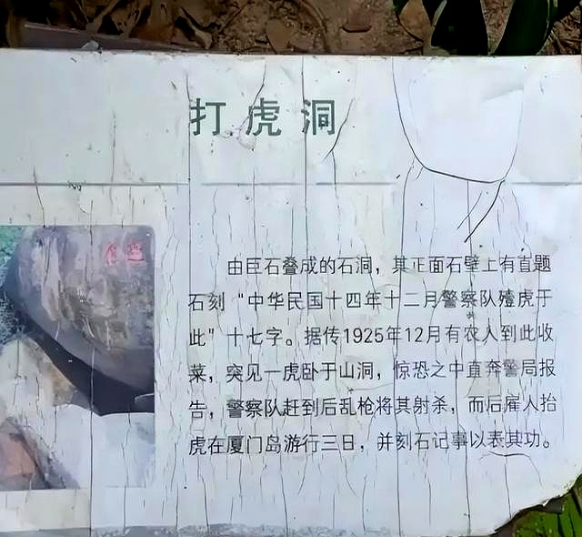 1925年,厦门中山公园打虎队用毛瑟手枪在植物园击毙一只雄虎,虎脑被当场拍卖,作价三十块大洋,围观人群把虎须拔光,回家挂在孩子脖子上“压惊”。