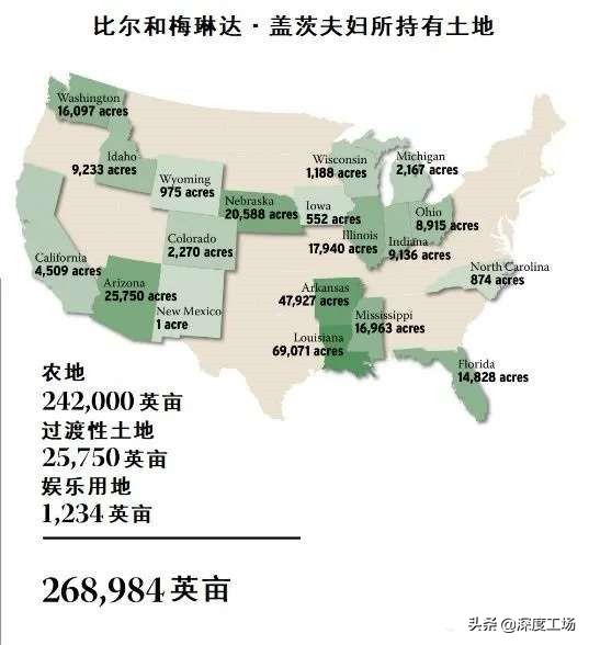 美国是一个大地主大资本家社会,在美国有很多超级地主。比如,全球著名富豪比尔·盖茨和他的妻子梅琳达),拥有近27万英亩(1英亩≈6亩)的农田。其在19个州拥有269,000英亩土地,其中路易斯安那州有69,071英亩、阿肯色州有47,927英亩和亚利桑那州的25,750英亩,持有量最大。美国CNN的老板特纳,拥有20万英亩以上的土地。