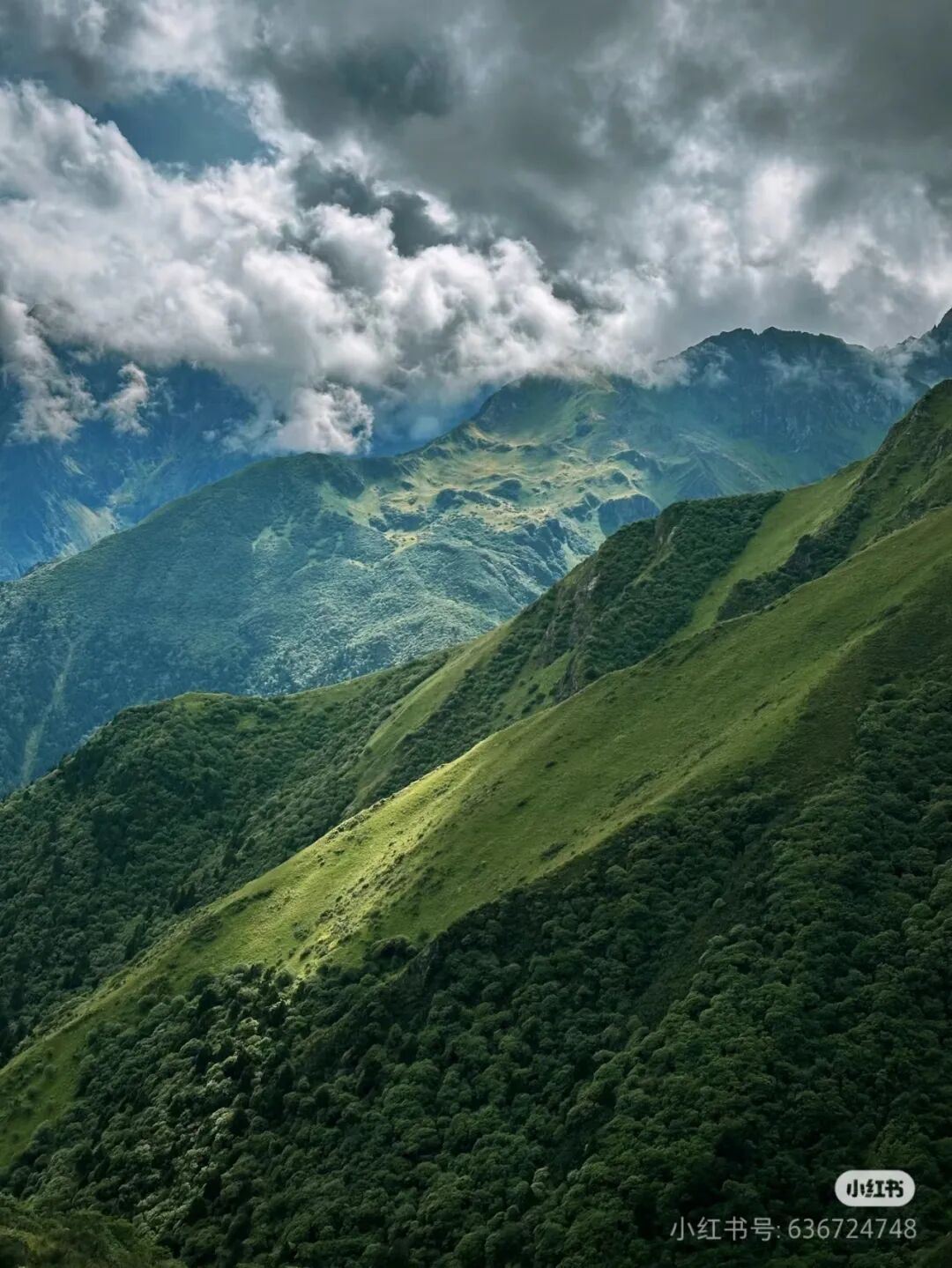 前一段路都在小森林里,走完这段路就到高山草原地带,后面的风景也更美,连绵的高山被绿色覆盖,看起来像一张软绵绵的地毯。