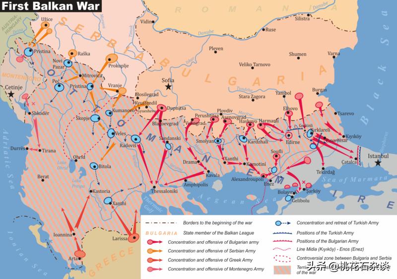 第一次巴尔干战争以巴尔干民族(红黄箭头)的大胜告终
