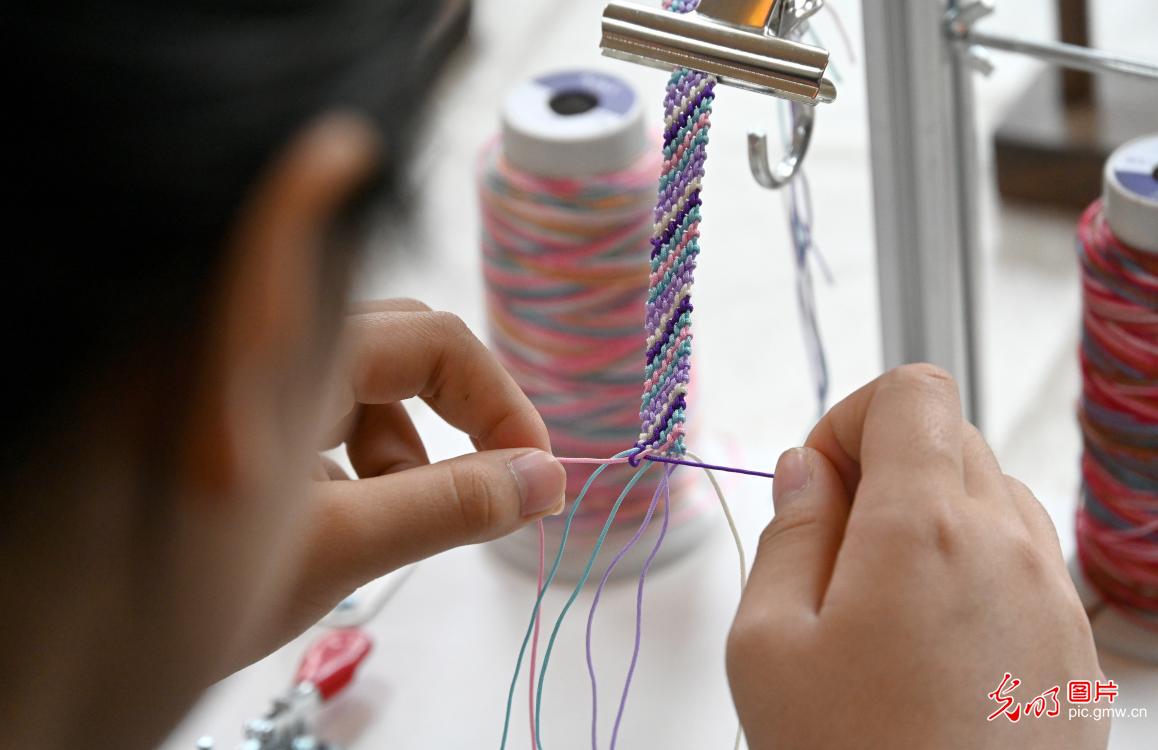 绳艺,作为我国非物质文化遗产,承载着吉祥、团结与美好的寓意,其历史可追溯至上古先民的结绳记事。今年,河北省邯郸市复兴区铁路小学将绳结技艺引入小学课堂,并成立了"绳间事绳艺工作坊"。在工作坊中,学生们以五彩丝线为原料,精心编制出各种精美的结式与艺术造型,学生们在传承传统文化的同时,全方位提高自己的动脑动手能力和对美的鉴赏能力。(郝群英摄/光明图片)