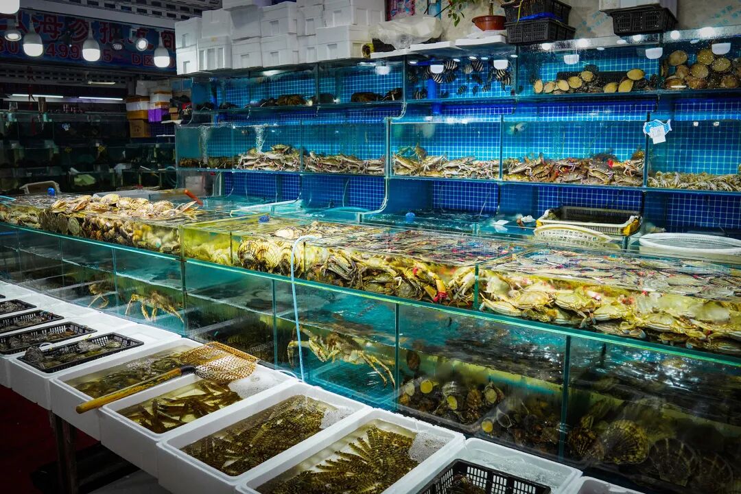 桃源市场是大连人最常去的海鲜市场之一。近200个摊位一字排开,市场空间宽敞、干净明亮,从飞蟹、虾爬子、海螺到海虾,品类极其丰富。