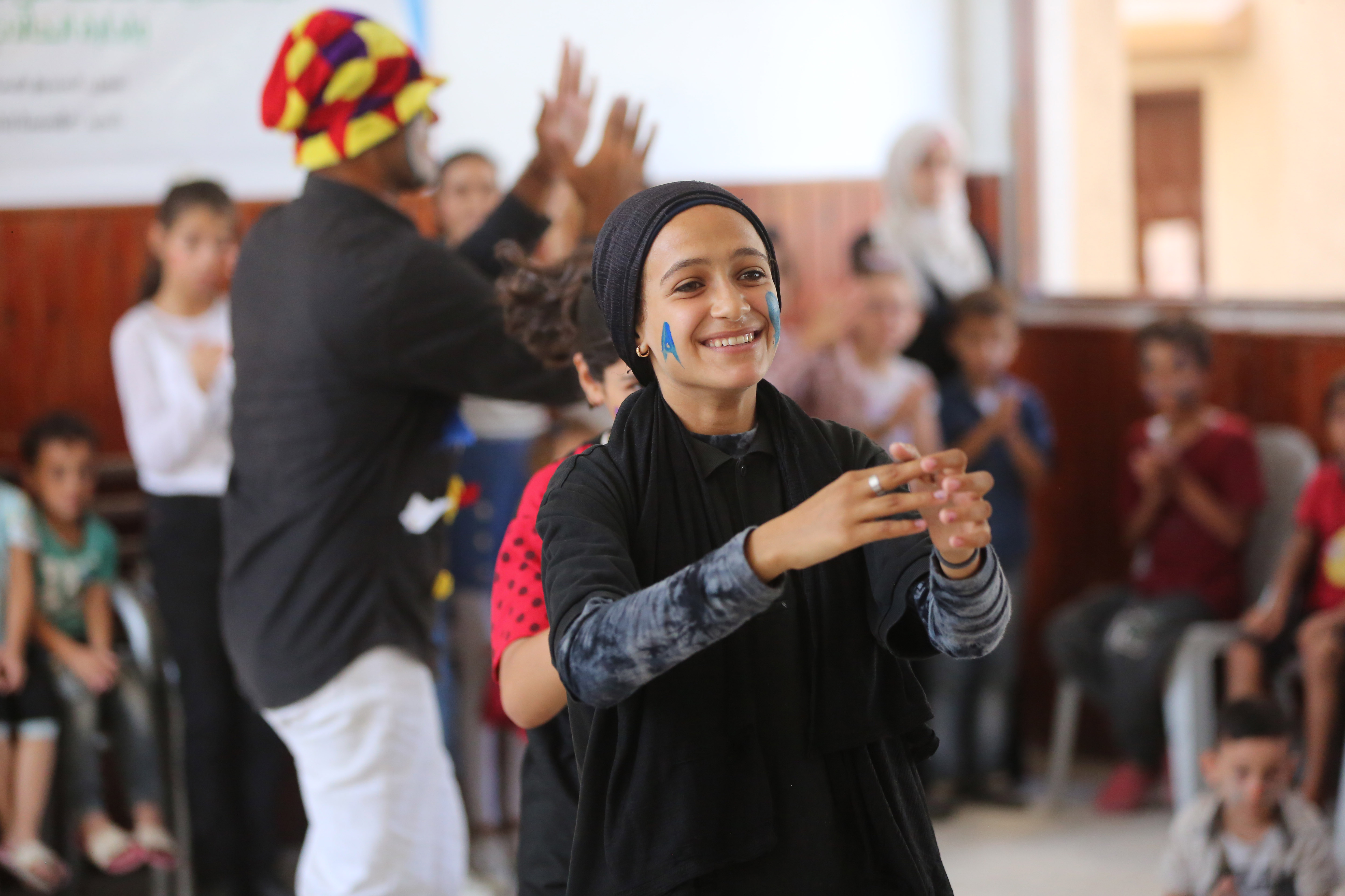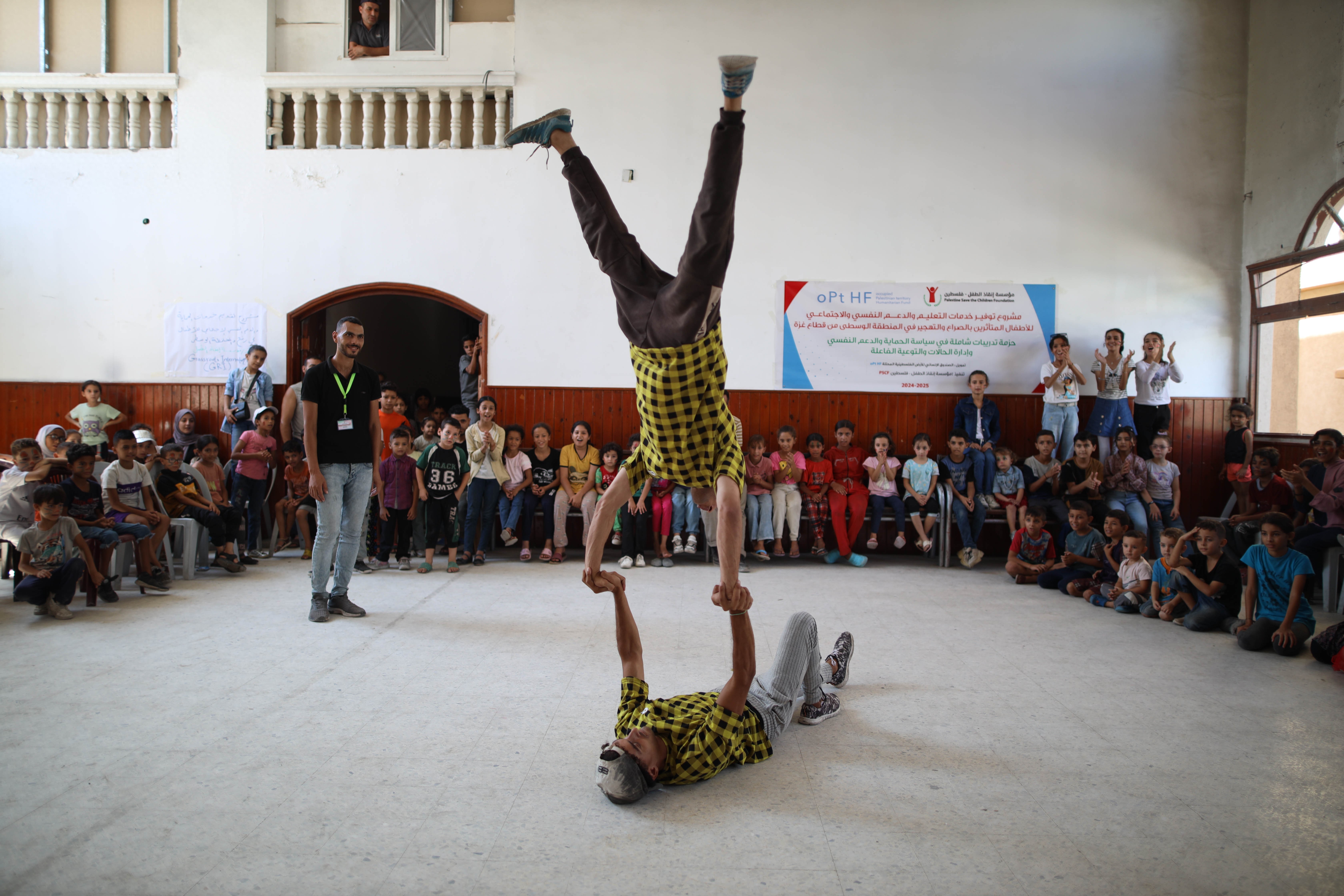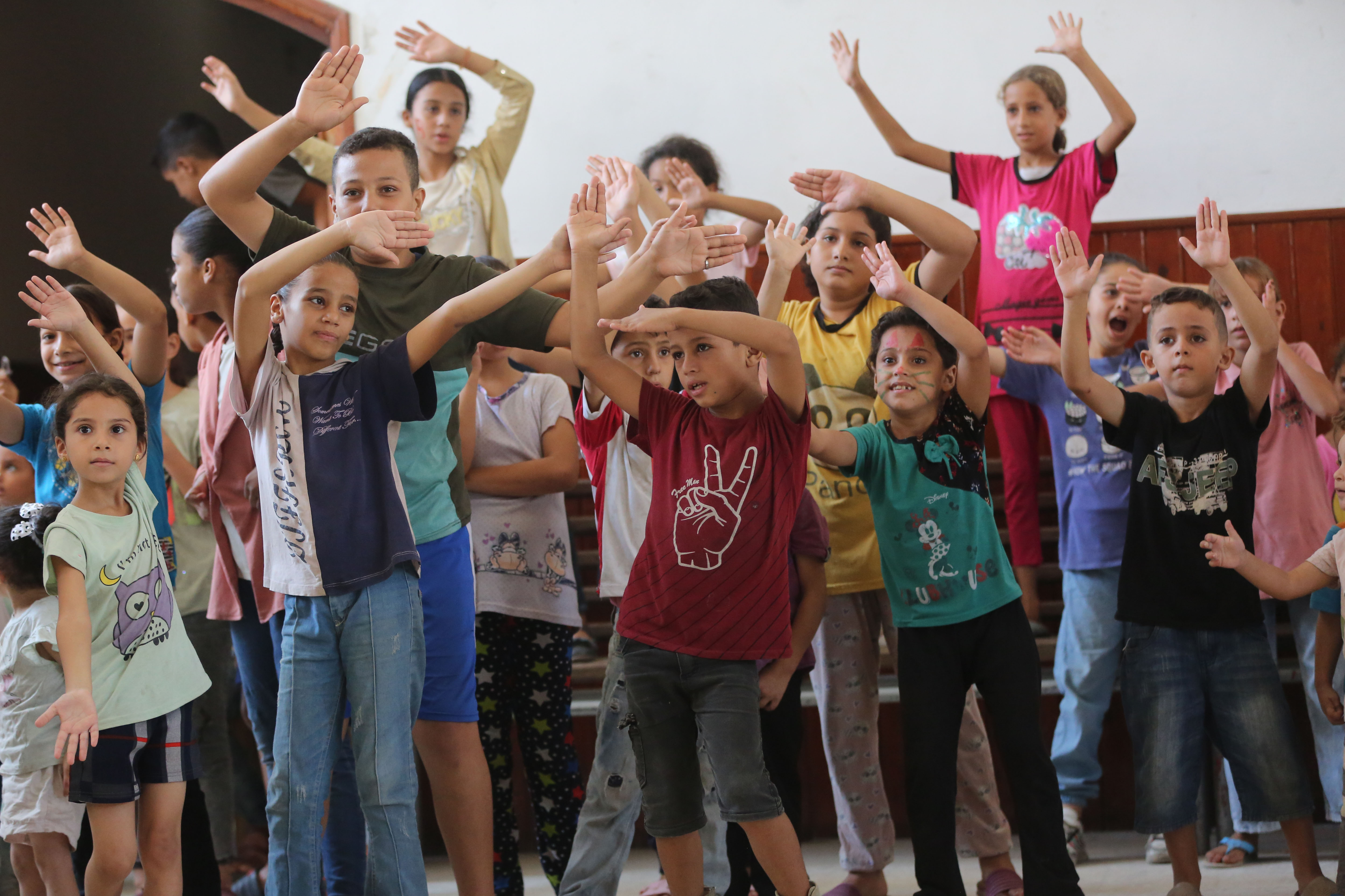 9月5日,在加沙地带中部的迈加齐难民营,巴勒斯坦志愿者为加沙地带儿童举办娱乐活动,以缓解战争带来的心理压力和创伤。