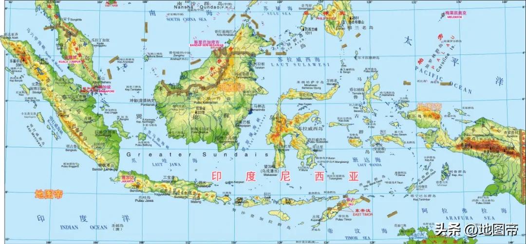 印度尼西亚位于亚洲东南部,地跨赤道,地处太平洋与印度洋的结合部,面积约191.36万平方千米,不算特别大,然而世界前十三大岛,有五个为印尼全部或部分占有,包括巴布亚岛(78.60万平方千米)、加里曼丹岛(74.81万平方千米)、苏门答腊岛(47.35万平方千米)、苏拉威西岛(17.46万平方千米)、爪哇岛(面积12.67万平方千米)。