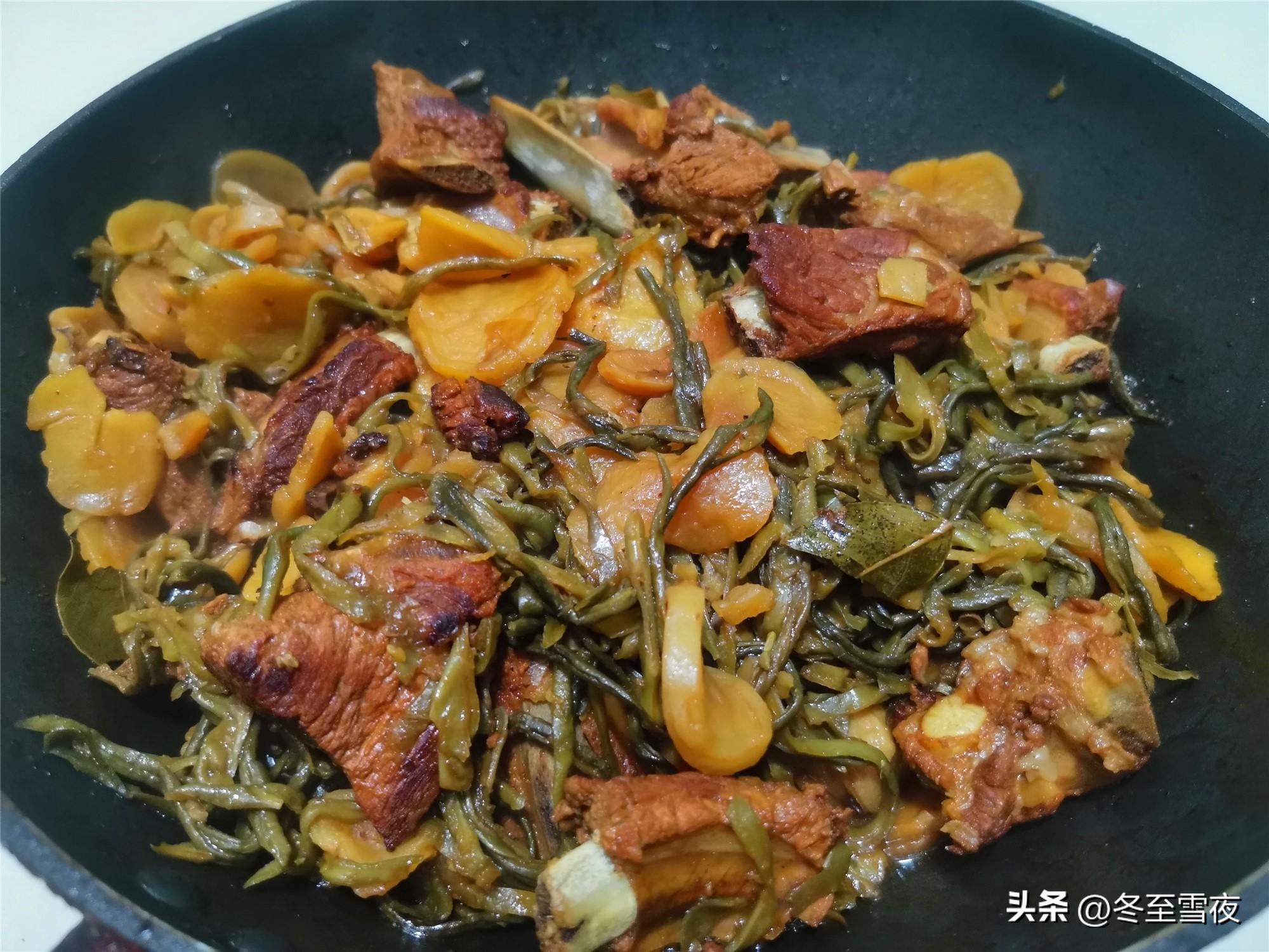 8.下入泡好的土豆干和豆角干,大火烧开,转小火,继续炖制半小时。