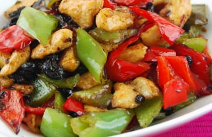 6.约2分钟后放入鸡片,调入酱油、白糖,少量盐,因为豆豉酱里面已经有咸味了,如果口轻的可以不放盐。搅拌均匀盛出即可