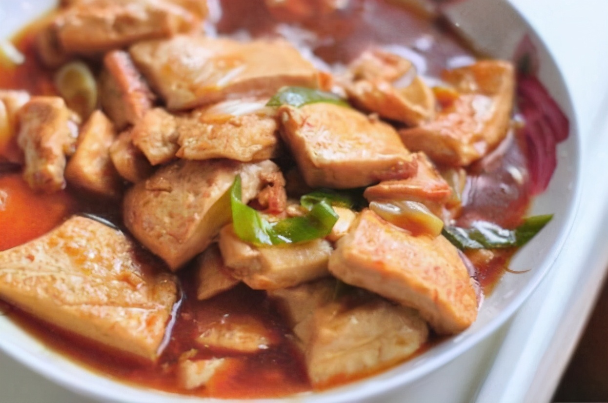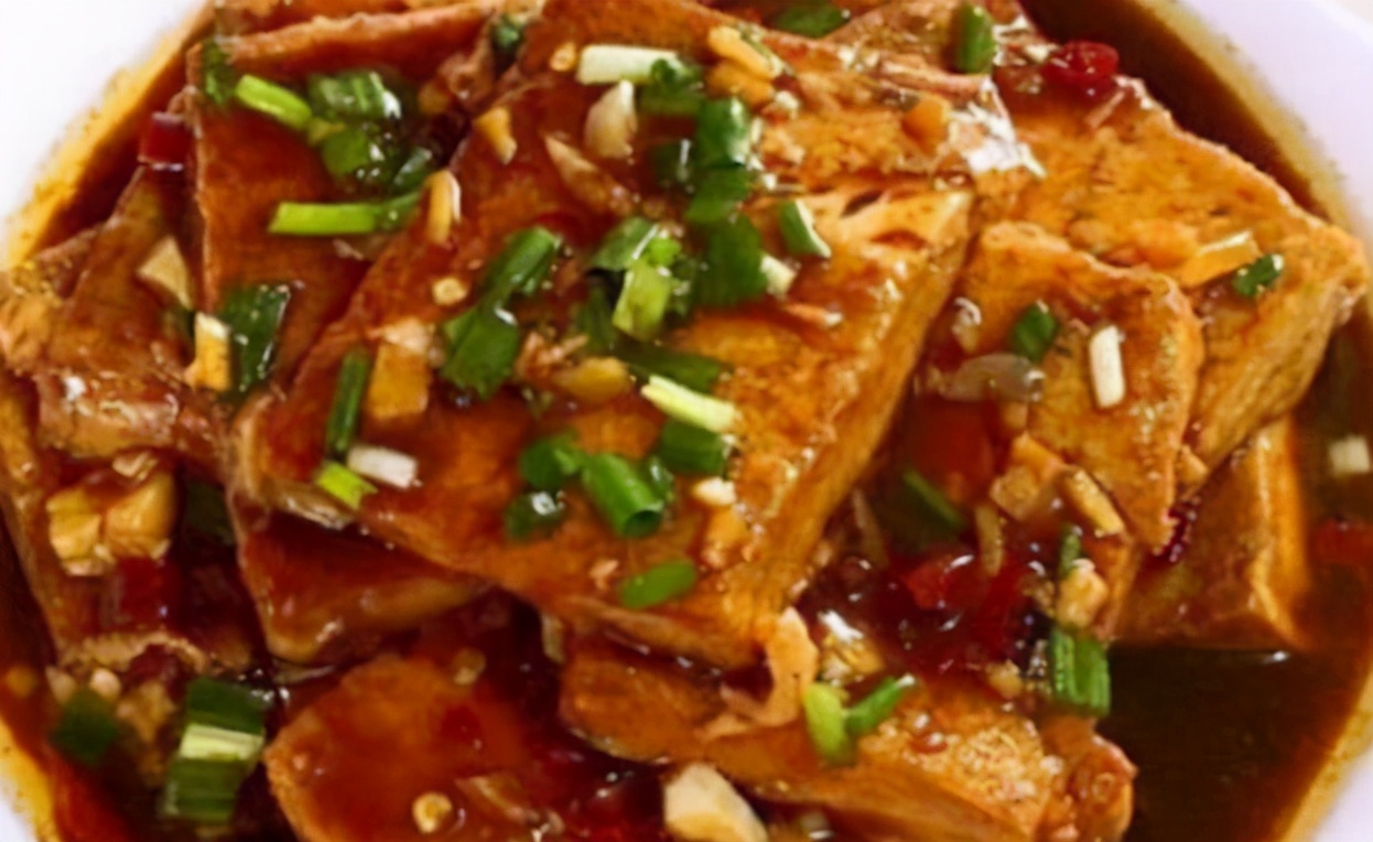 食材: 老豆腐1块,老抽1勺,生抽1勺,蚝油1勺,糖少许,姜、蒜、干辣椒、葱各适量
