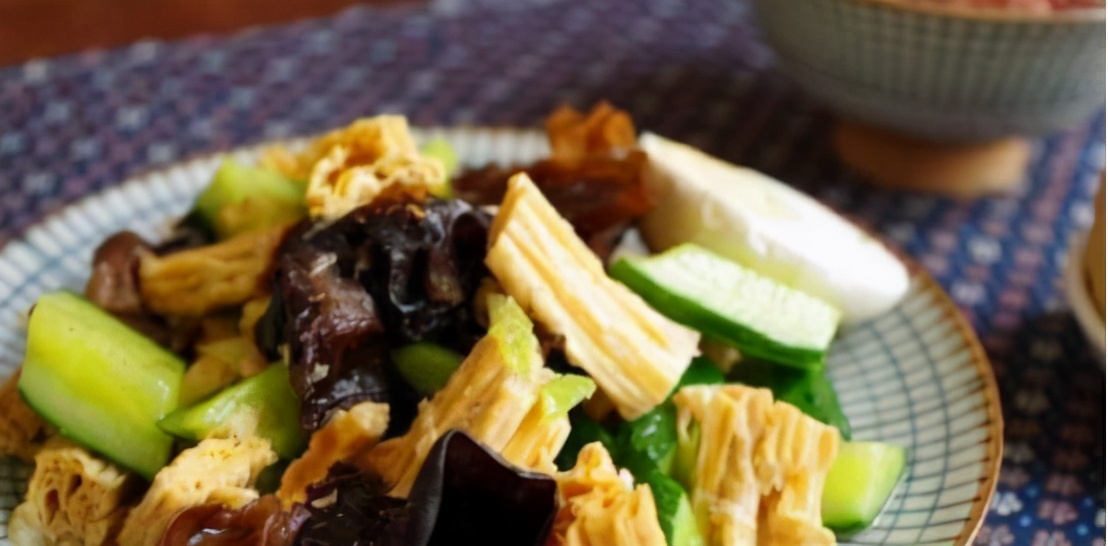 食材:腐竹,木耳,黄瓜,葱花,酱油,糖,盐,淀粉